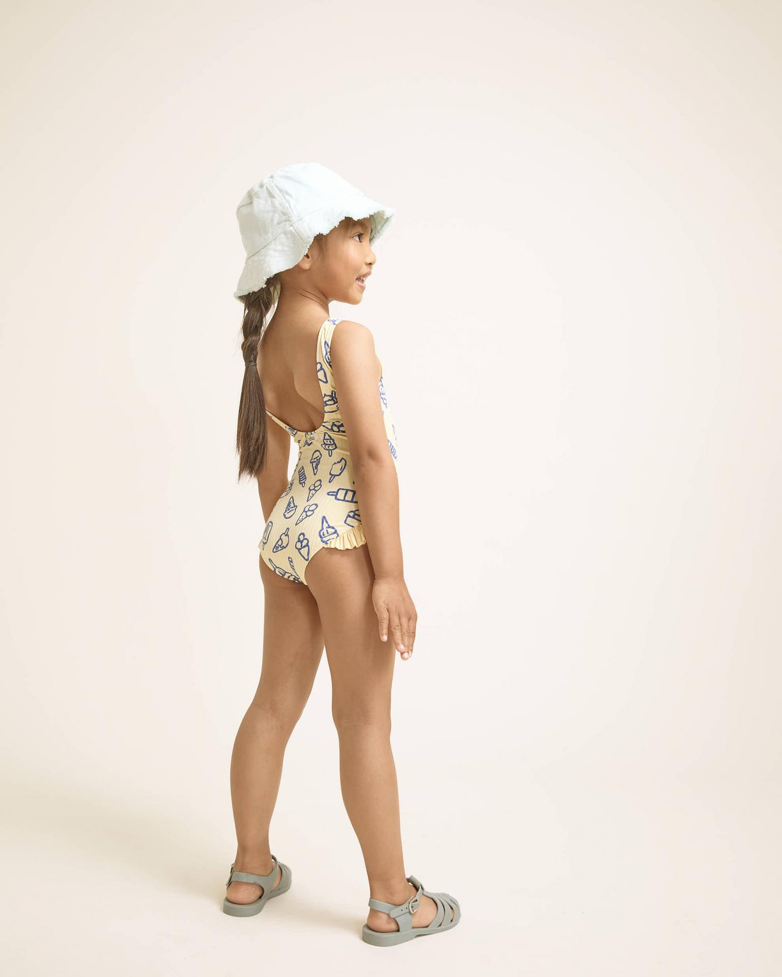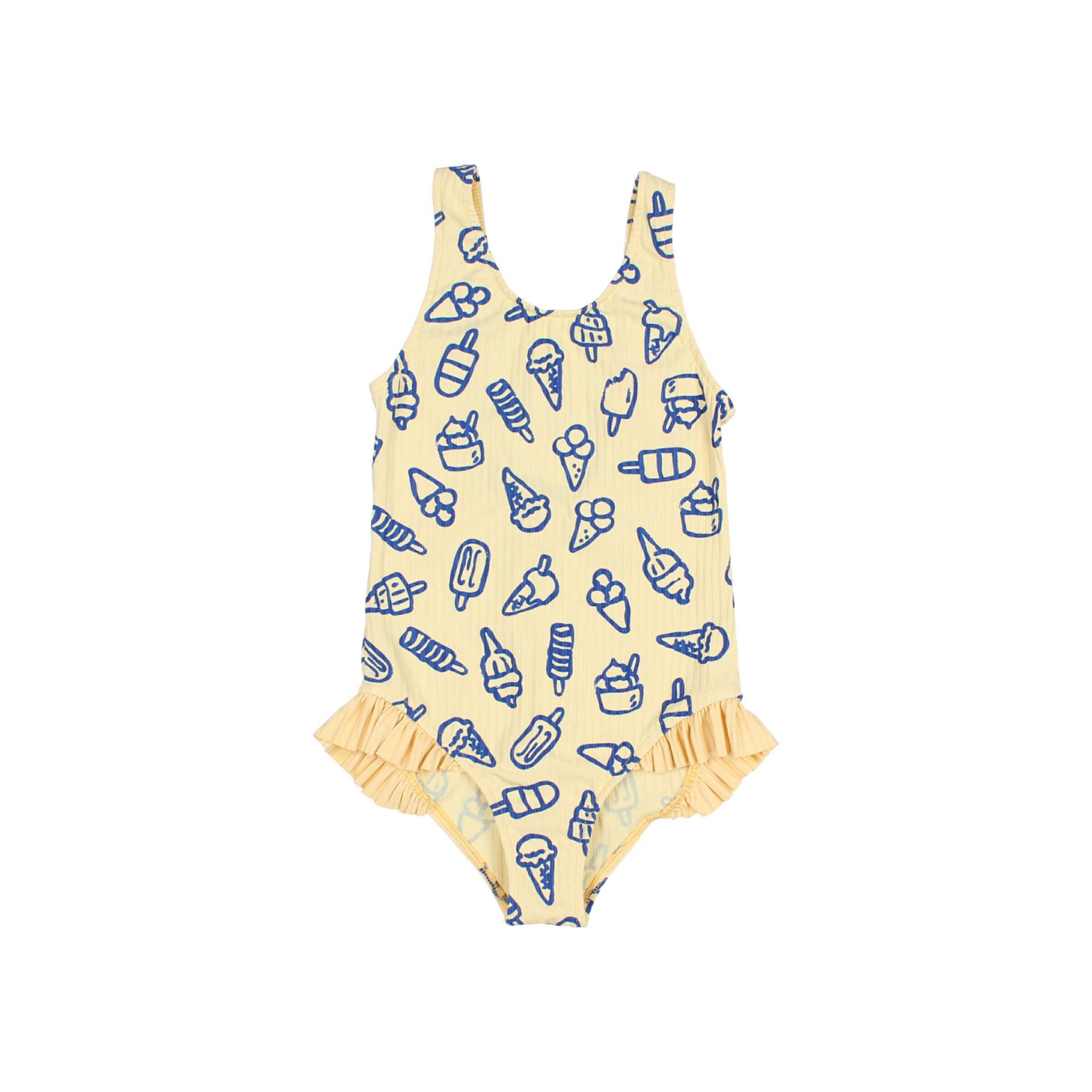 Maillot de poliamida acanalada con estampado ice cream. Escote redondo. Espalda con escote pronunciado. Muslos elásticos para un mayor ajuste. Volantes en el lateral del bajo. 88% Poliamida, 12% Elastano. Fabricado en España.