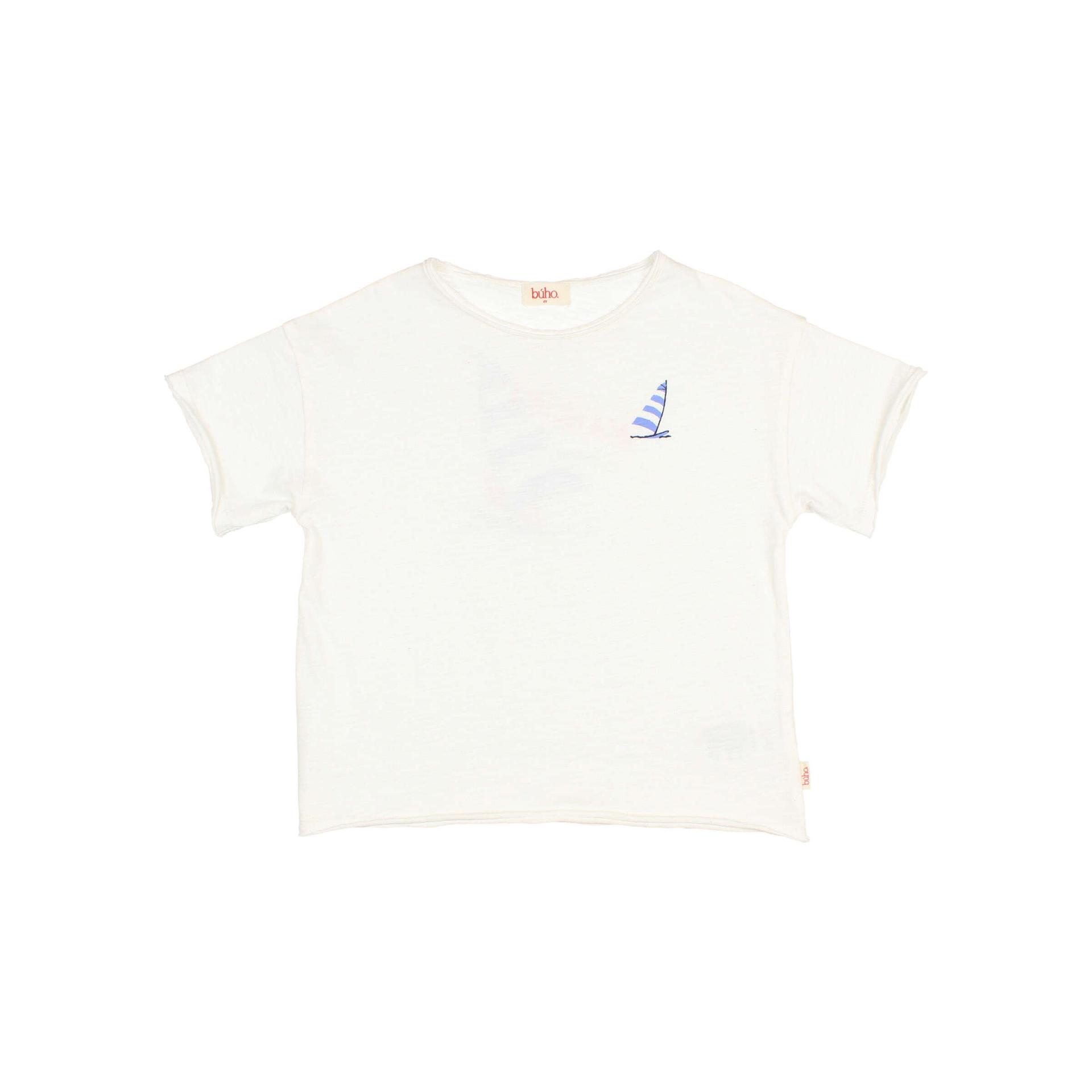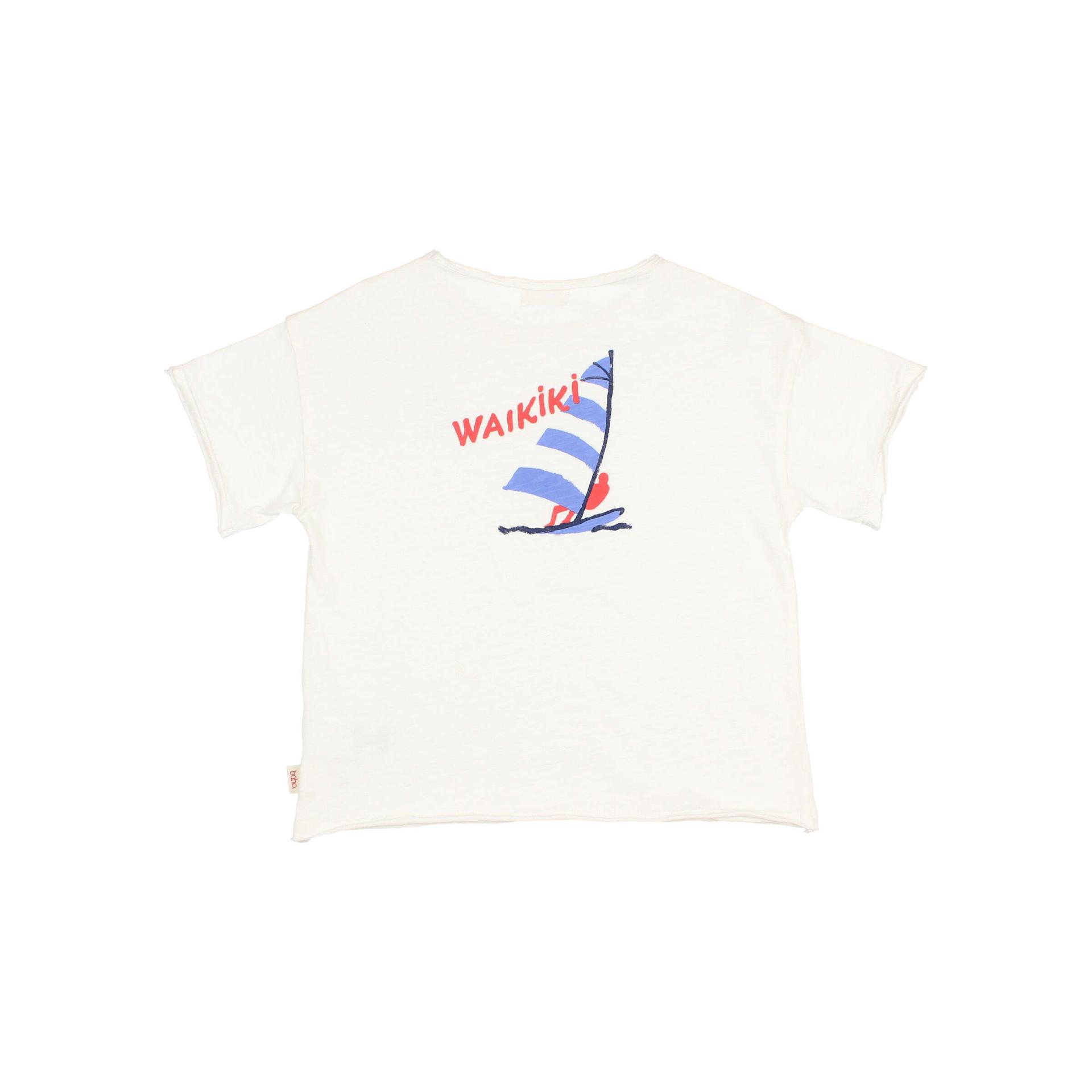 Camiseta de algodón orgánico de manga corta. Estampado barco en el pecho. Estampado Waikiki en la espalda. Cuello redondo. 100% Algodón Orgánico. Fabricado en Portugal.