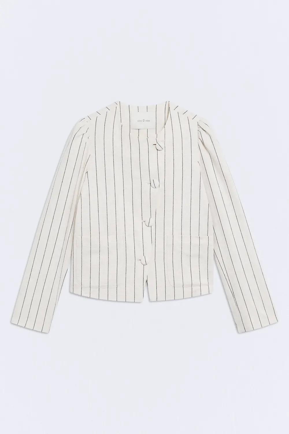 La chaqueta corta Beillini es una prenda confeccionada en mezcla de algodón y lino, que combina frescura y estructura en tono beige con rayas.