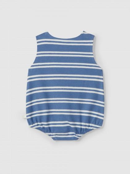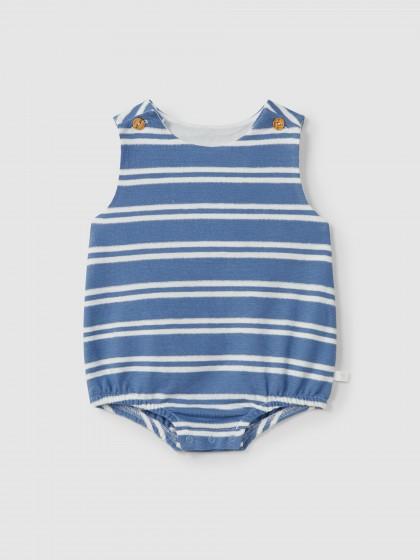 Ranita en punto de felpa ligera y fresca 100% algodón a rayas. Cierra con botones de madera Laranjinha en los hombros y broches en la entrepierna.