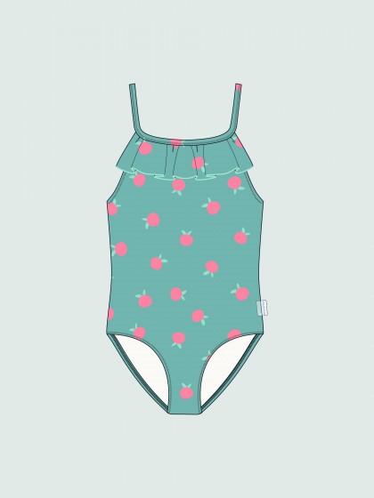 Bañador en licra con estampado de manzanas y detalle de volante en el pecho. Tirantes ajustables para un mejor ajuste.