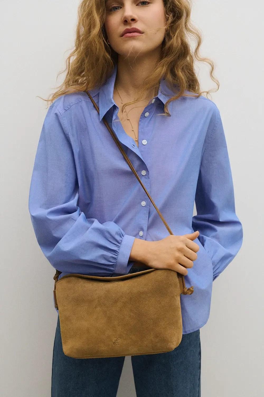 Bolso de hombro de piel con doble asa. Cierre con imán. Bolsillo interior con cremallera. Funda protectora incluida. En color camel.