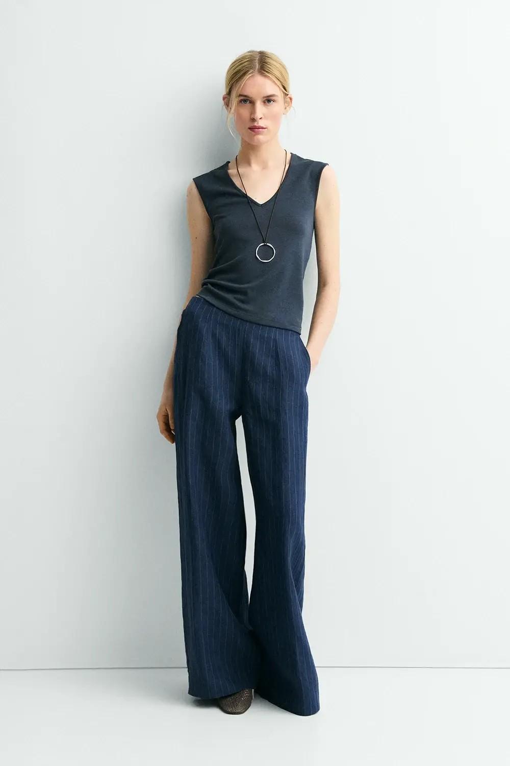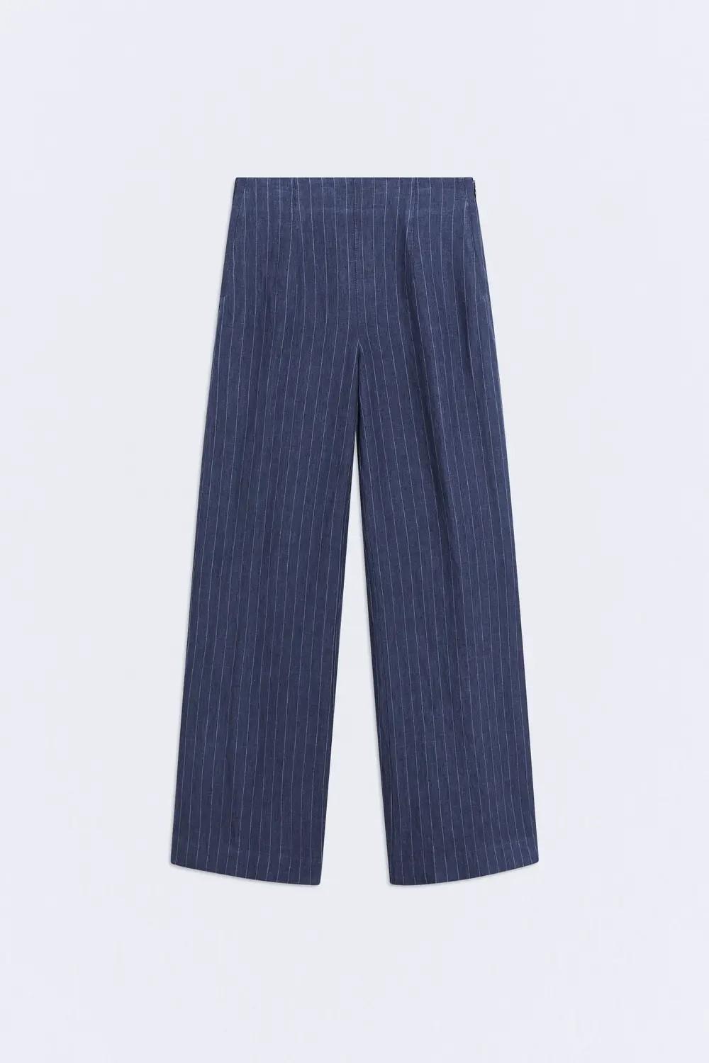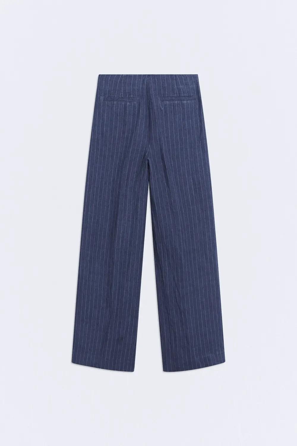 El pantalón Yukata está confeccionado en 100% lino y combina frescura y ligereza en un tono azul marino con rayas.