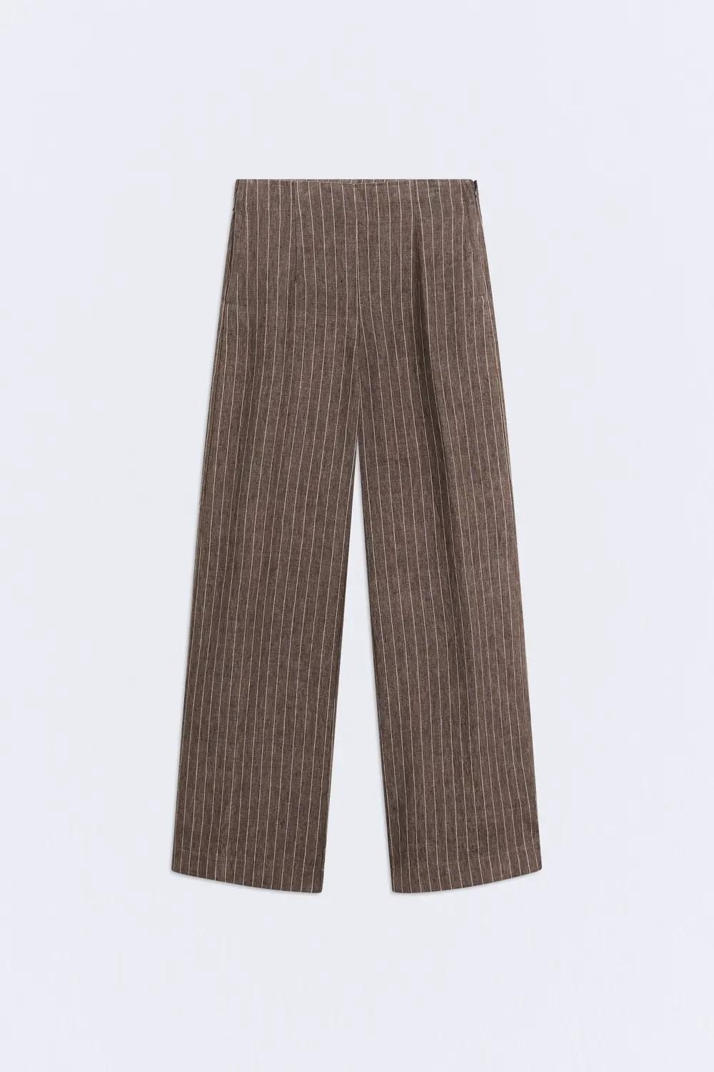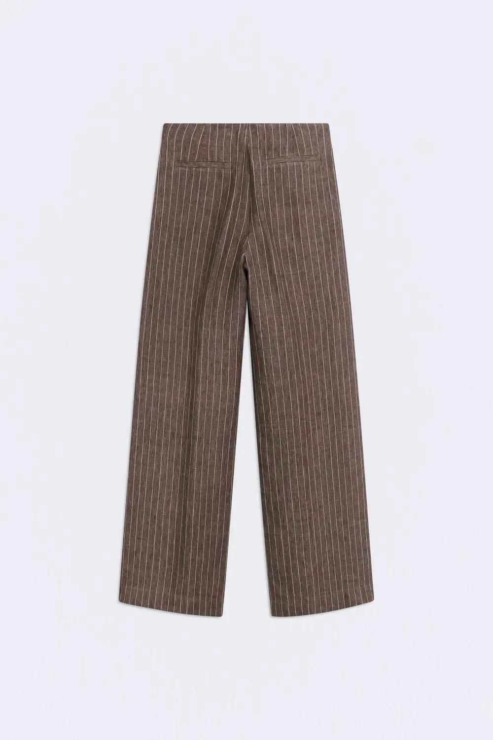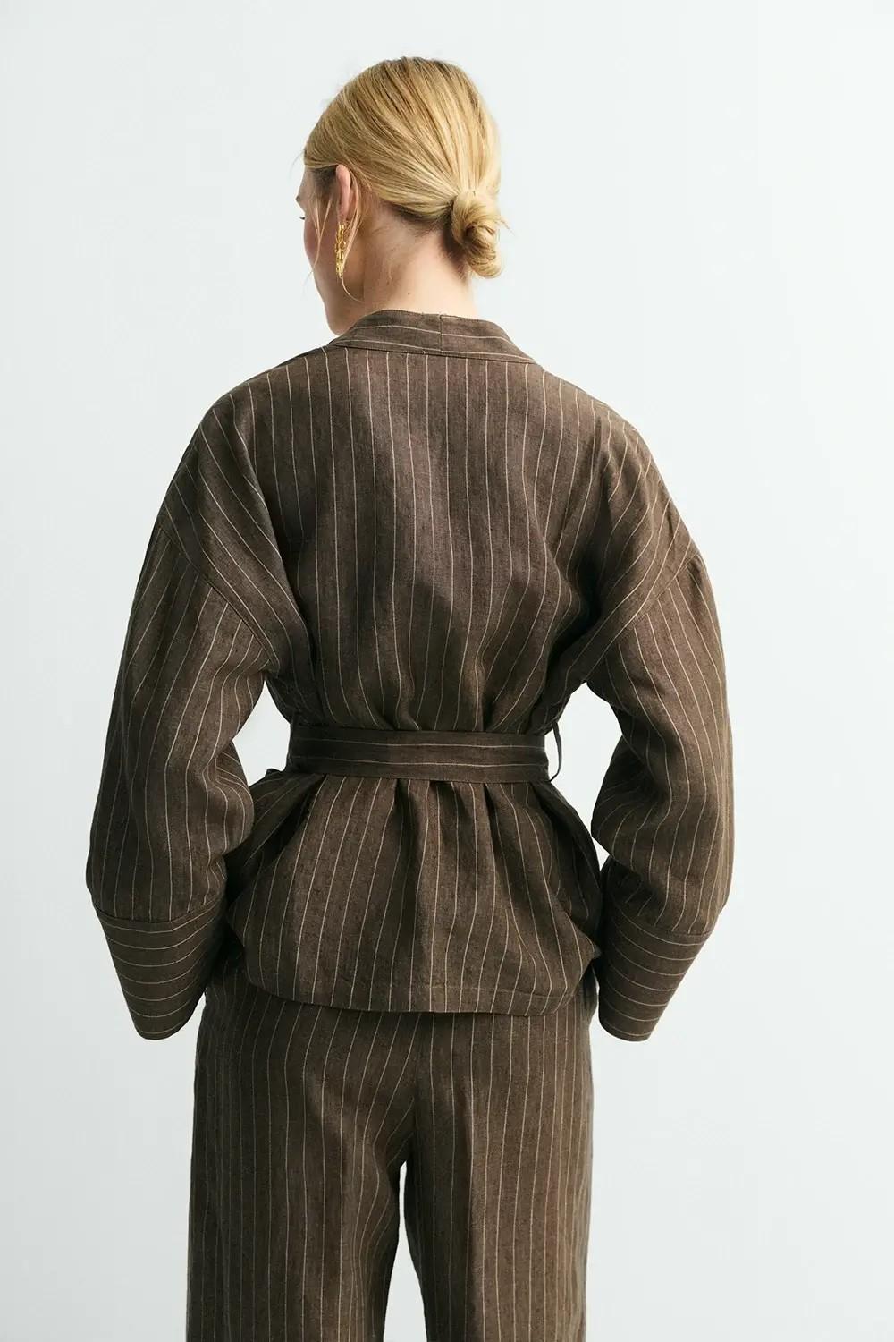 El pantalón Yukata está confeccionado en 100% lino y combina frescura y ligereza en un tono marrón con rayas.