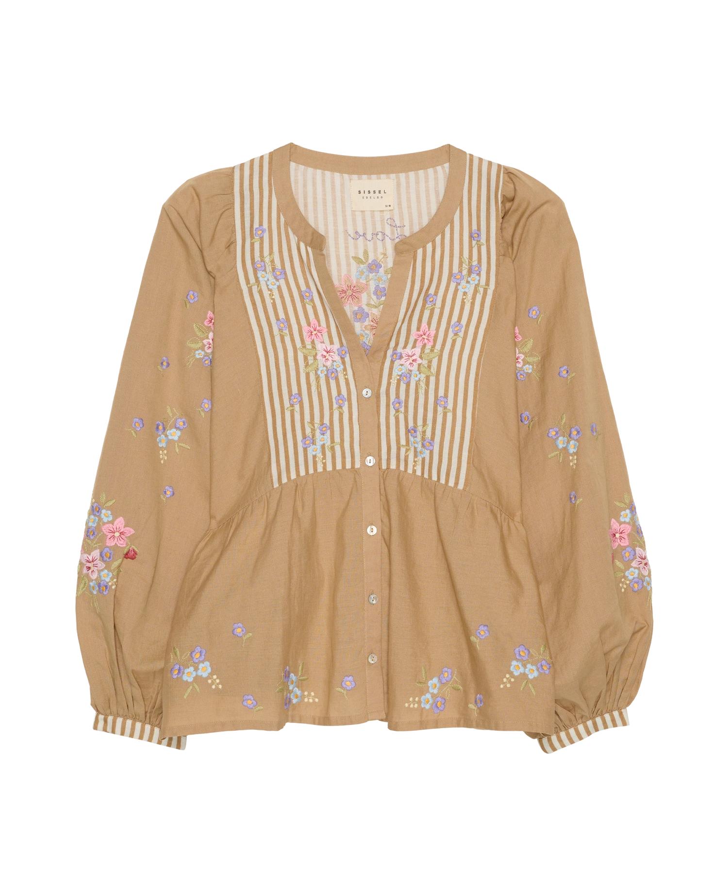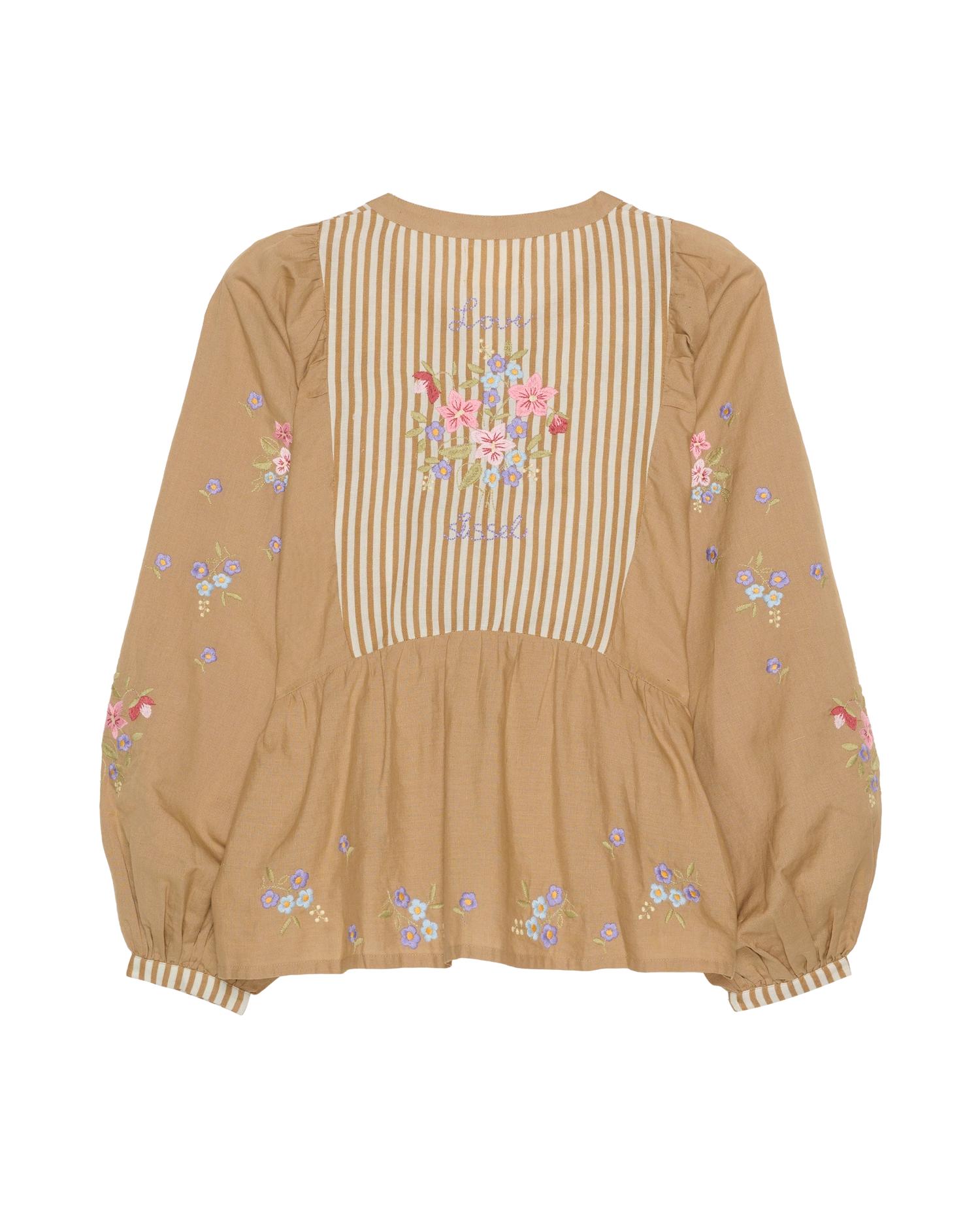 El top Bellisima tiene un corte holgado pero femenino y está confeccionado en una mezcla de algodón orgánico y lino. Presenta mangas anchas abullonadas y un corte en la cintura con frunces. Tiene una tapeta frontal con botones de nácar claro. El top está decorado con un poético bordado floral en un color contrastante que se extiende por toda la prenda como detalle decorativo.