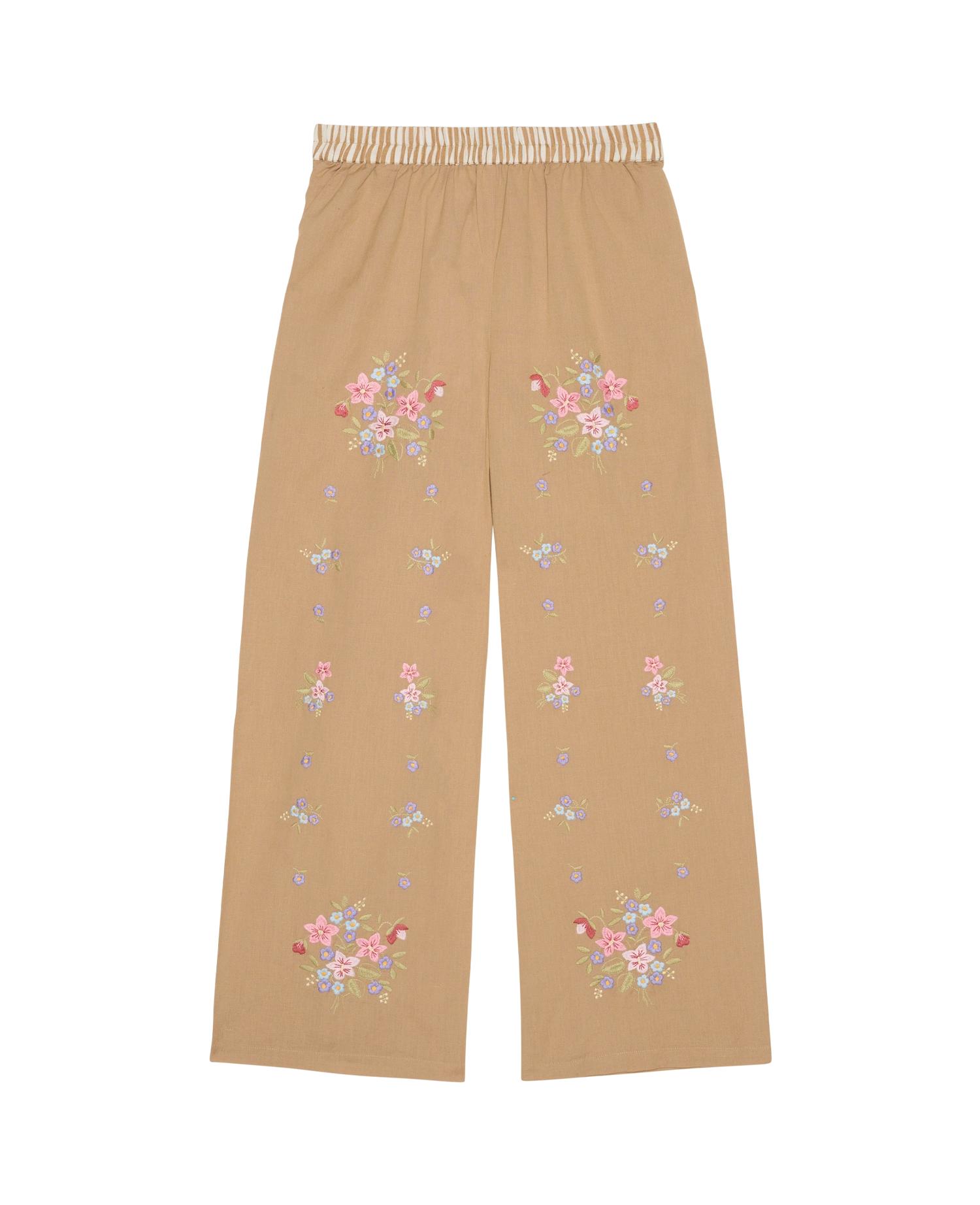 Los pantalones Bellisima tienen un corte relajado y pernera ancha, y están confeccionados en una mezcla de algodón orgánico y lino. Cuentan con una cinturilla elástica ancha que proporciona un ajuste cómodo y bolsillos en las costuras laterales. La parte delantera está decorada con un delicado bordado floral en un color contrastante.