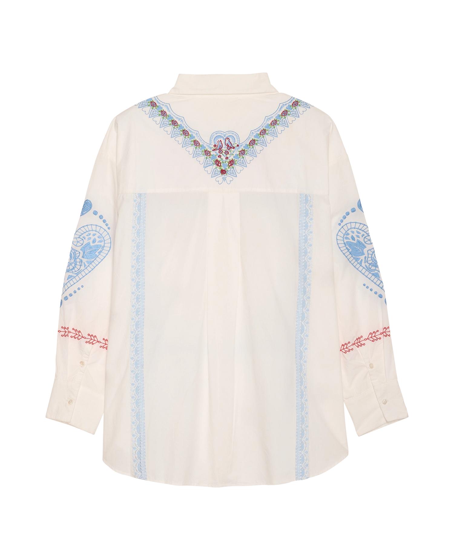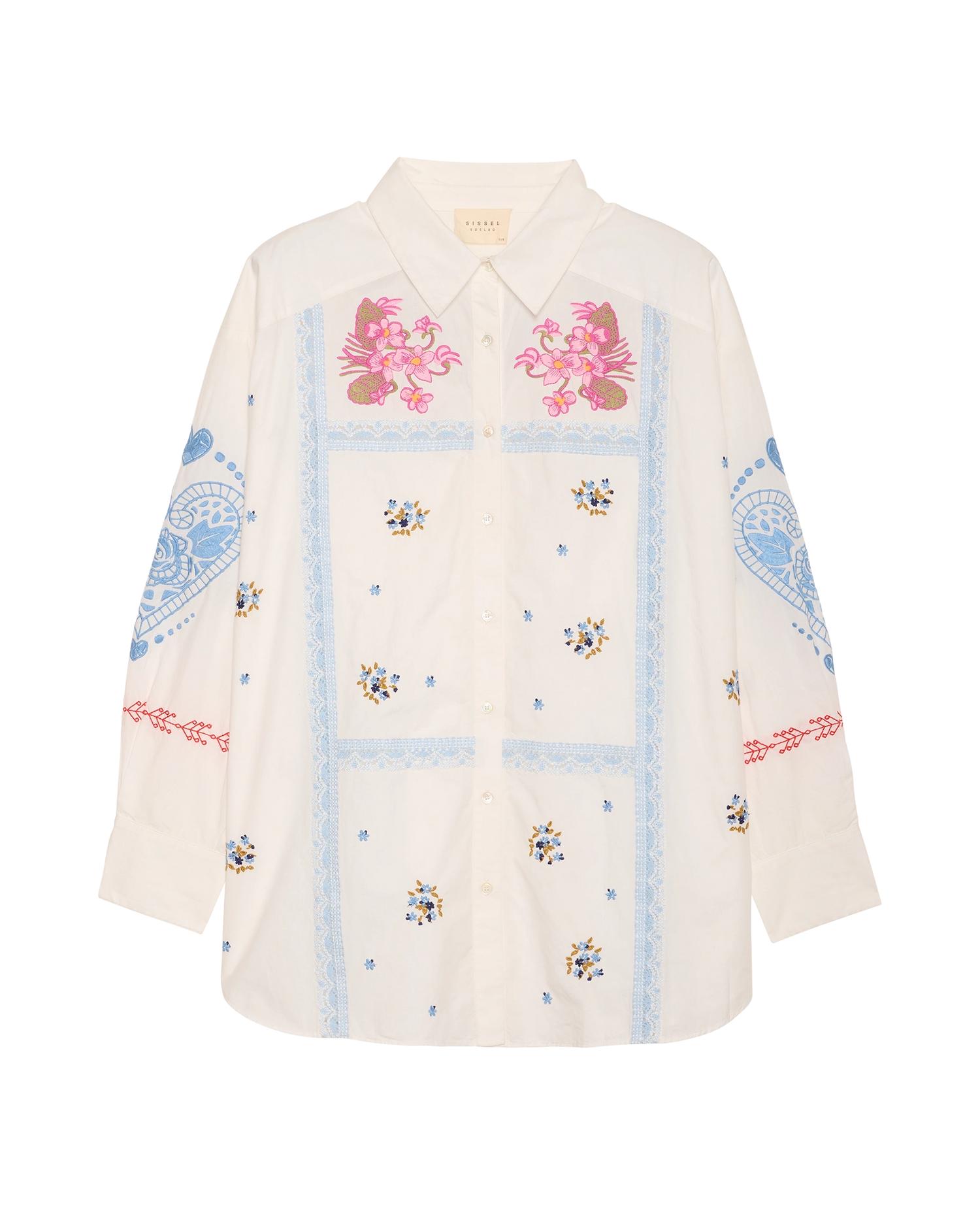 La camisa Camma tiene un corte recto y holgado con hombros anchos y está confeccionada en algodón orgánico. Presenta mangas largas y regulares con puños, un cuello clásico y cierre de botones en la parte delantera. El bajo curvado le aporta un toque suave y femenino. La camisa está bellamente decorada con bordados poéticos de flores y corazones, complementados con delicados lazos de encaje que realzan su estilo romántico.