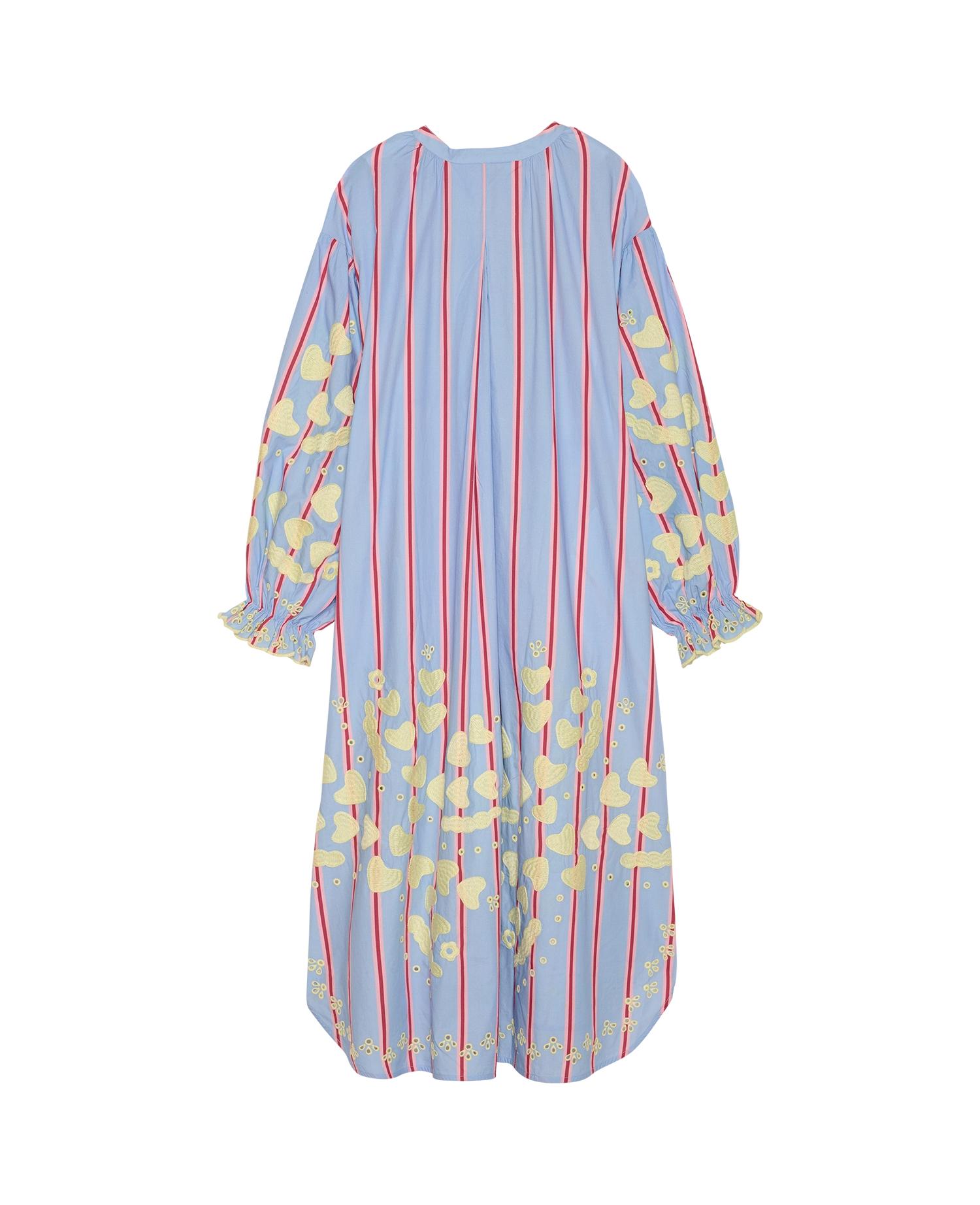 El vestido Elisabeth es un vestido casual pero femenino, confeccionado en popelina de algodón 100% orgánico. Presenta hombros caídos y mangas voluminosas con frunces y pequeños puños en las aberturas. El cuello tiene frunces alrededor del escote y botones de nácar en la tapeta frontal. Los bolsillos se ubican en las costuras laterales. El vestido está decorado con nuestro bordado de corazones característico, delicadamente colocado en el pecho, el bajo, el volante de la manga y la parte inferior del vestido.
