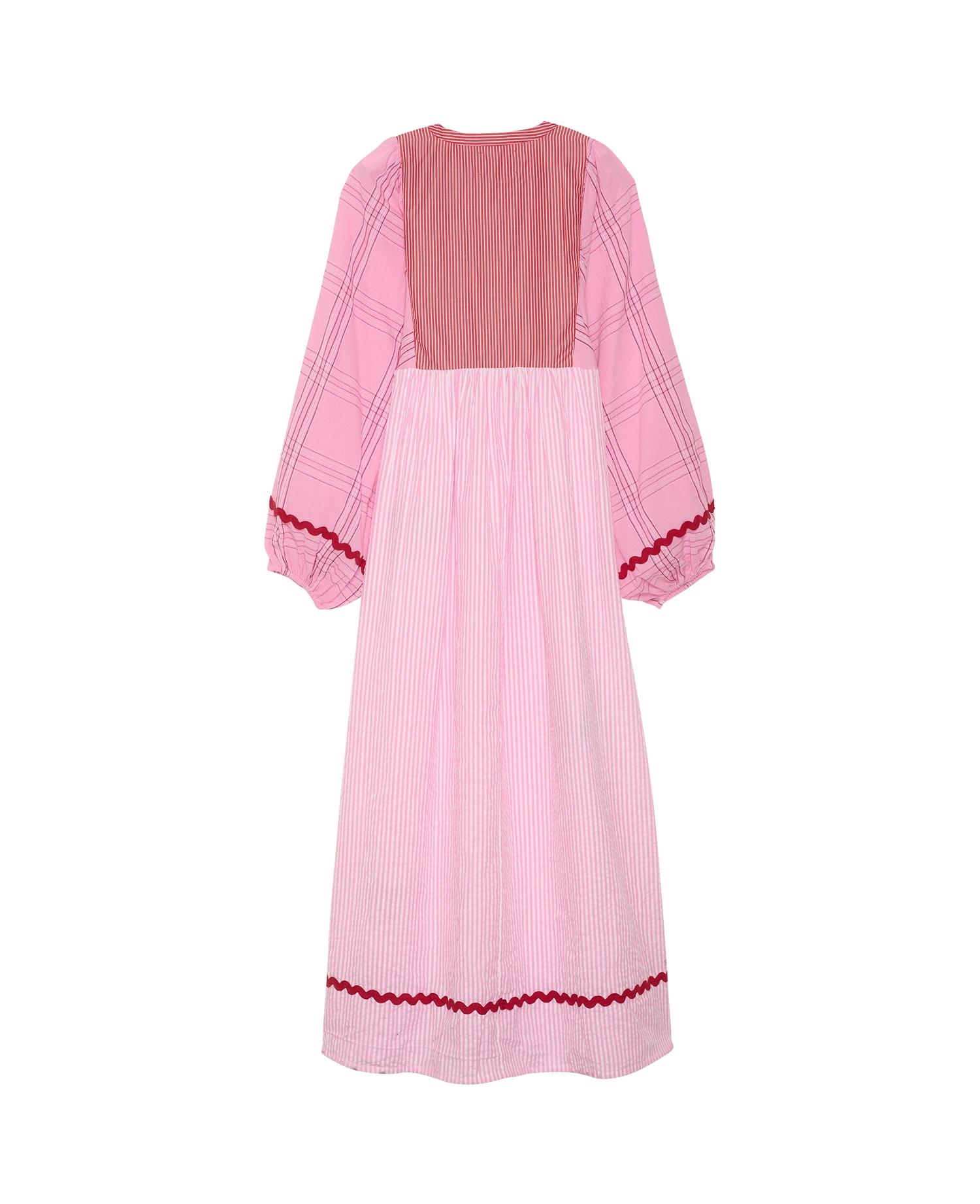 El vestido Gaia tiene un corte amplio y está confeccionado con una hermosa mezcla de algodón teñido con retales. Presenta un escote con frunces debajo del pecho que realzan la silueta femenina. Las mangas son anchas y abullonadas, con elástico en el interior de las aberturas. Tiene escote redondo con cuello fino y una abertura en la parte delantera, rematada con cordones. El vestido está adornado con encantadores motivos hechos con retales aplicados, algodón liso y delicados bordados, mientras que una llamativa cinta roja en zigzag añade un toque decorativo a las mangas.