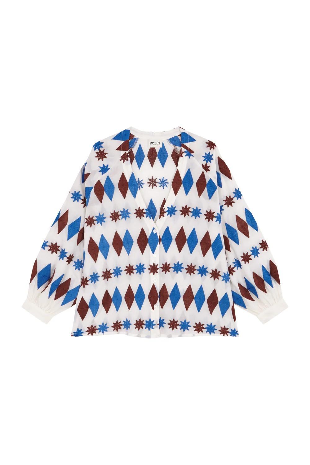 Camisa Vesper de color crudo con tejiduría de rombos y estrellas en tonos azul y marrón. Talla única