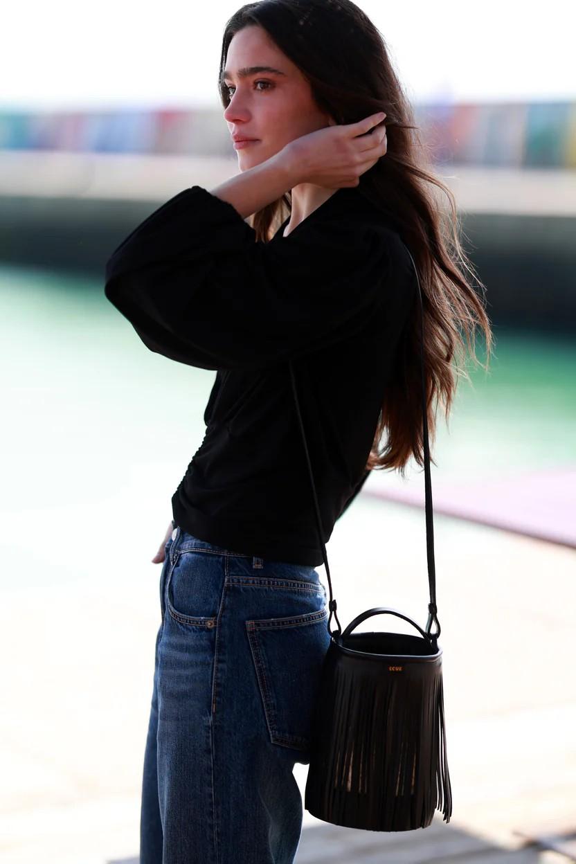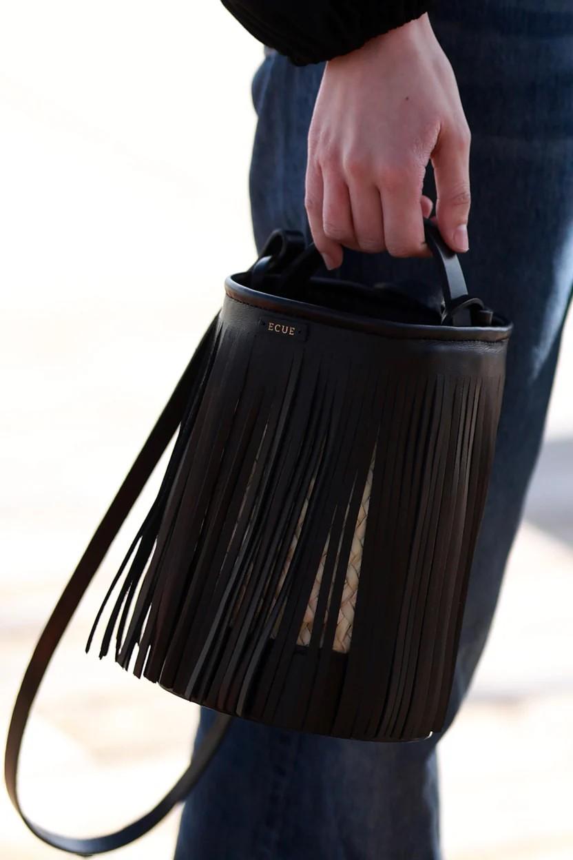 Los flecos de piel aportan movimiento y carácter, dejando entrever la trama natural de la cesta y creando un juego visual único. Su estructura, reforzada con base y boca en cuero, le da equilibrio, presencia y una silueta impecable.