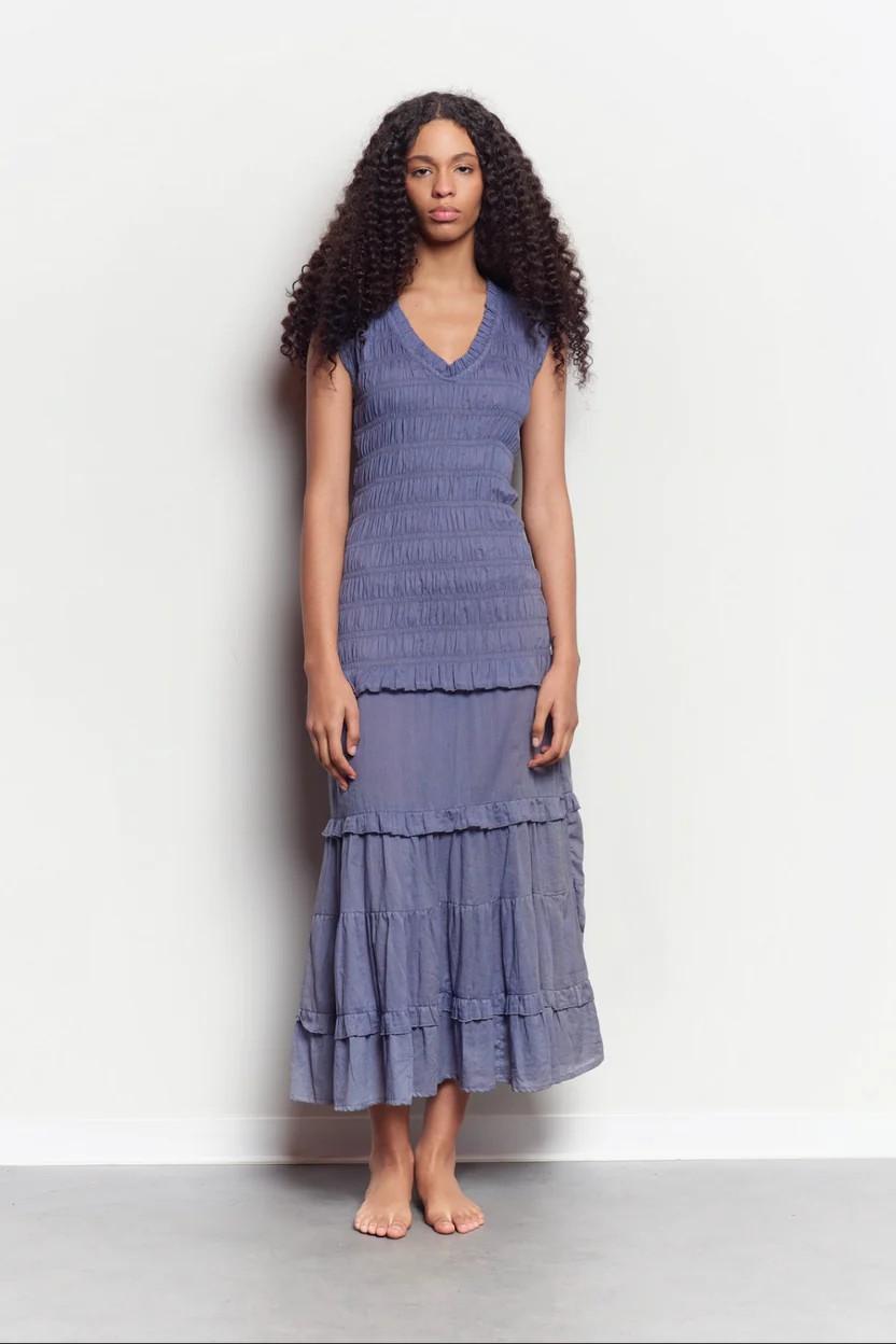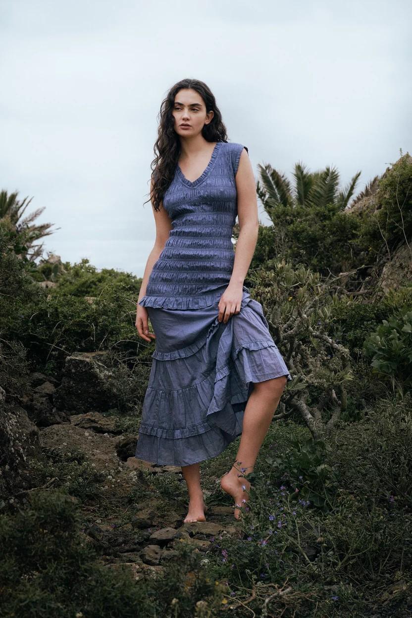 Vestido largo en color azul con cuerpo nido de abeja, escote en V y falda con volantes.