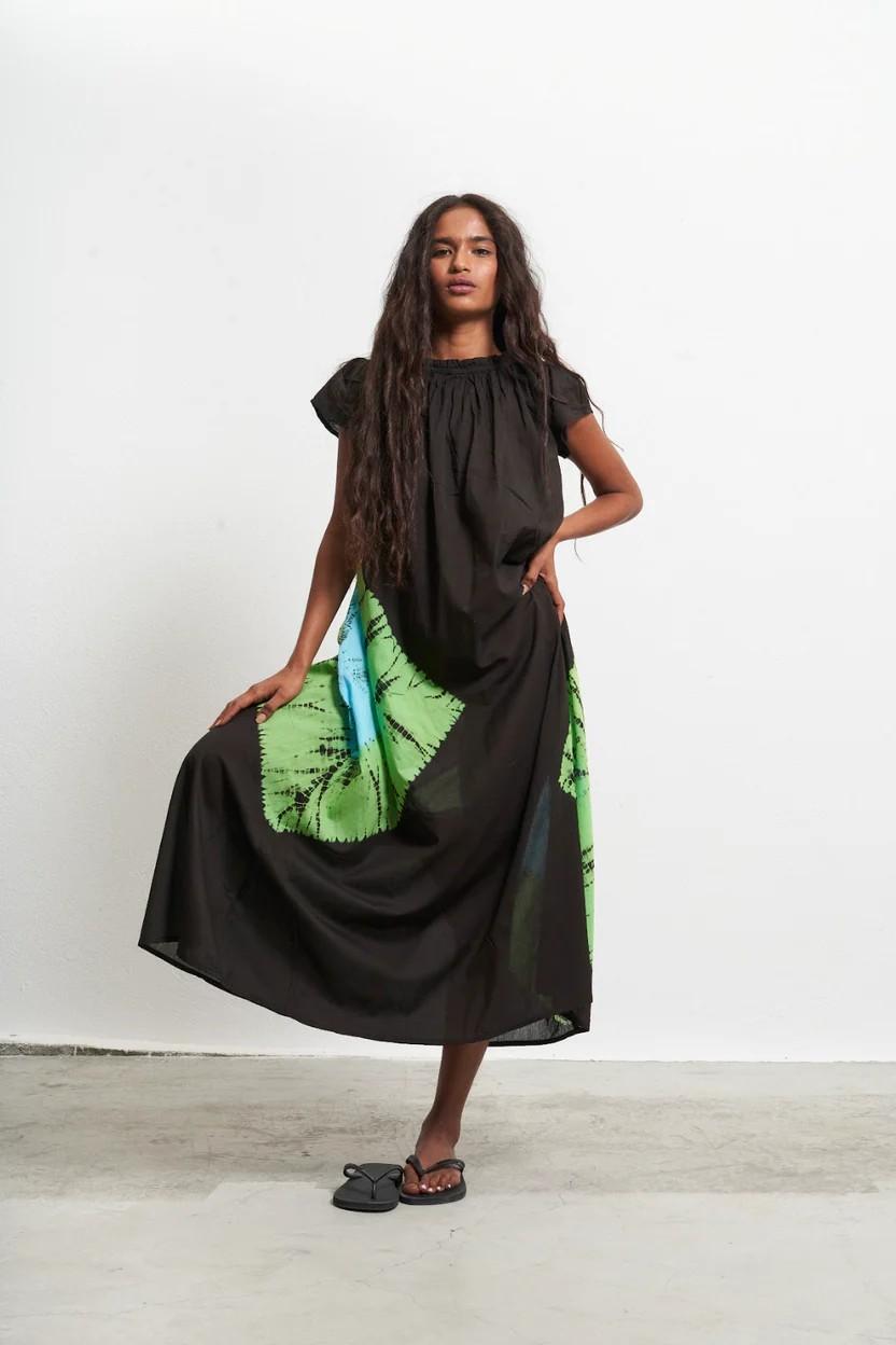 Elaborado a mano con tintes naturales y estampado shibori , cada prenda es única y puede presentar ligeras variaciones en su estampado.