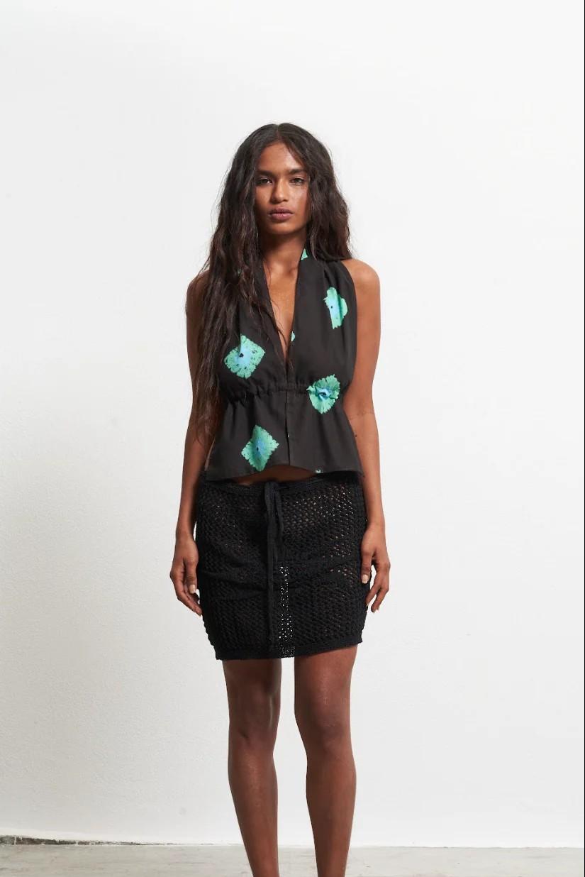 Elaborado a mano con tintes naturales y estampado shibori, cada prenda es única y puede presentar ligeras variaciones en su estampado.