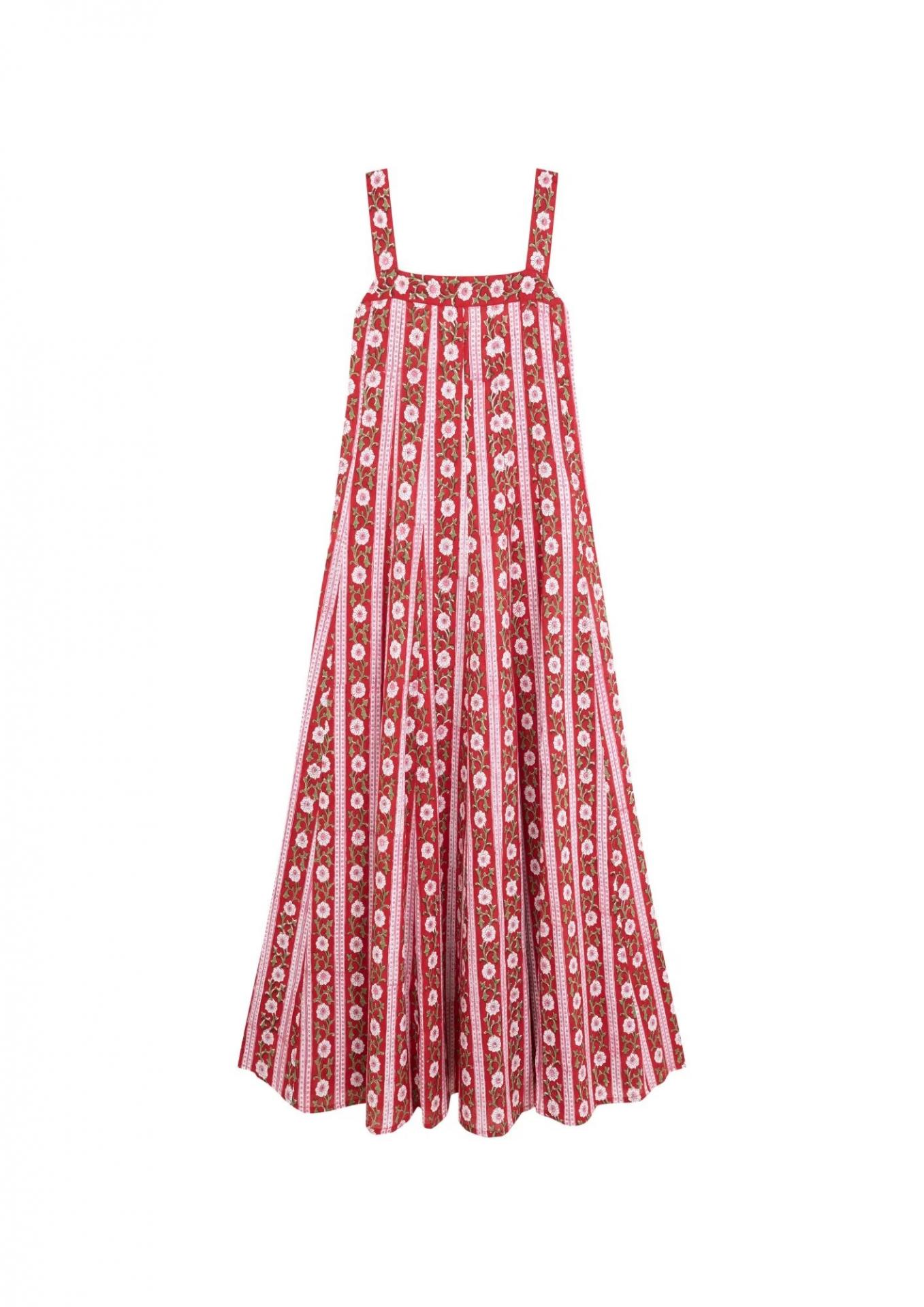 Vestido de escote cuadrado y tirantes anchos. Lazada en la espalda para ajustar al pecho y corte evasé. Estampado floral rosa sobre base roja. Talla única.