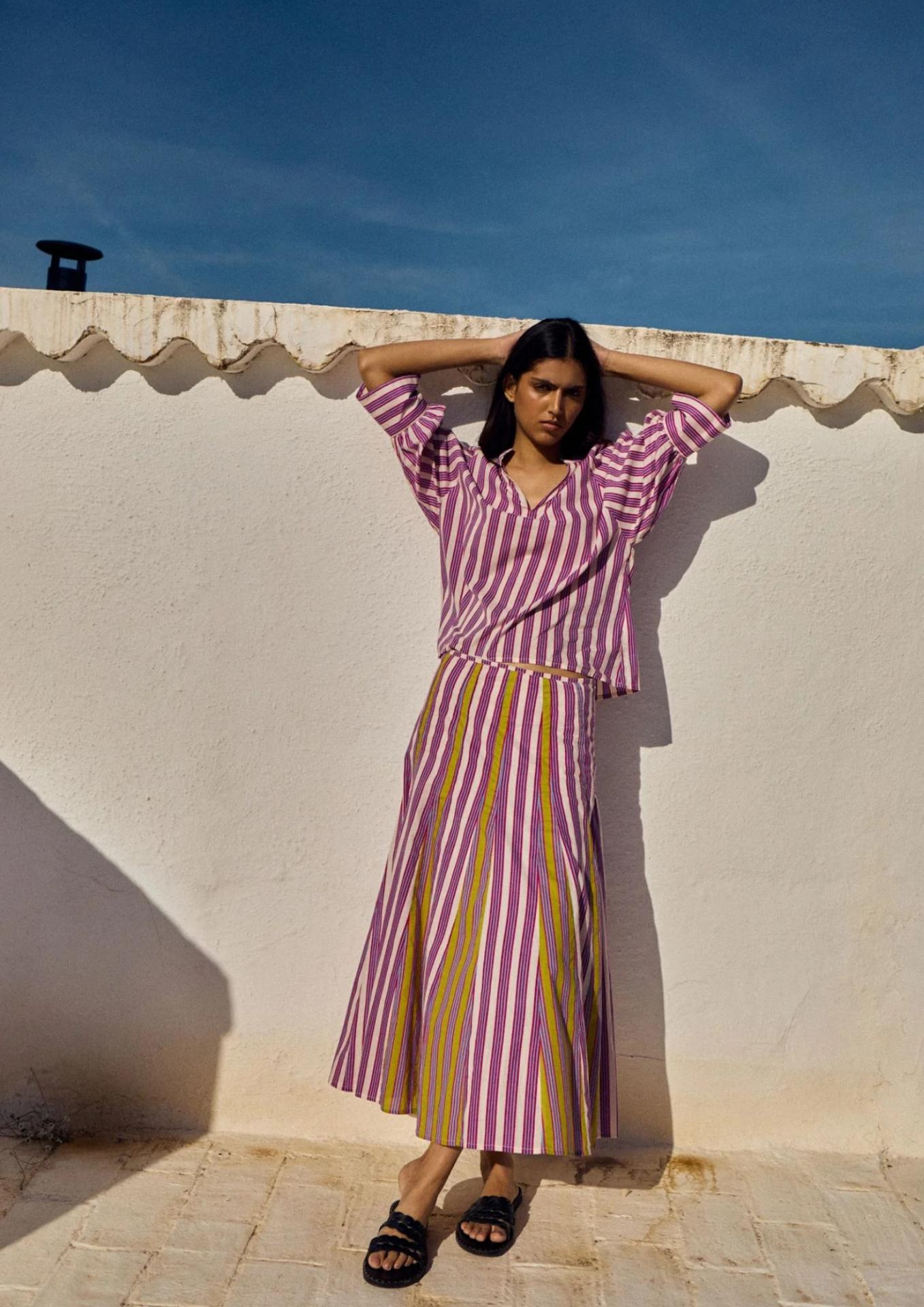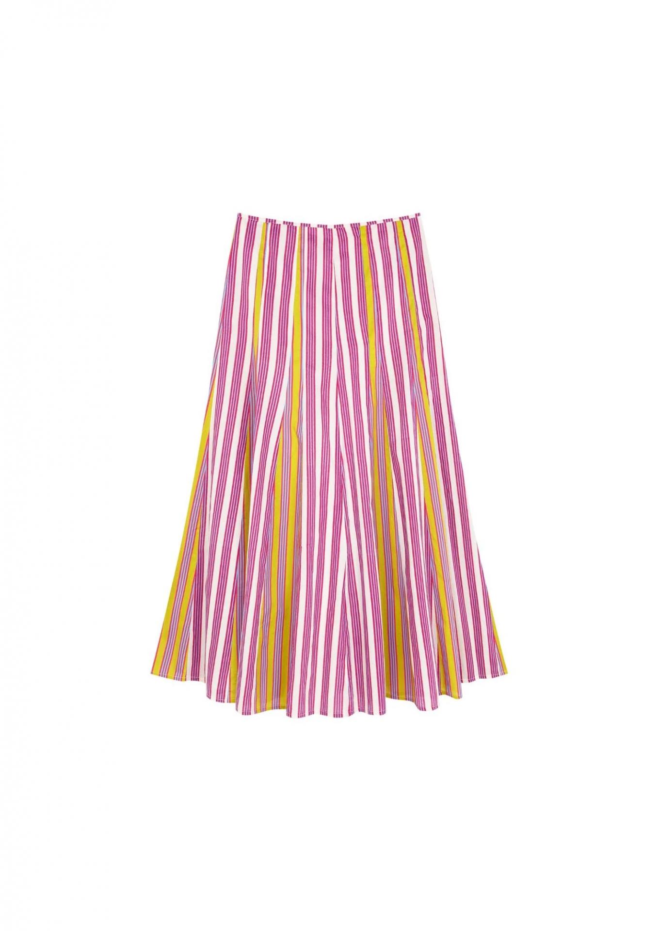 Falta midi paneles con corte evasé y cierre con cremallera lateral. Estampado bicolor de rayas sobre fondo blanco.