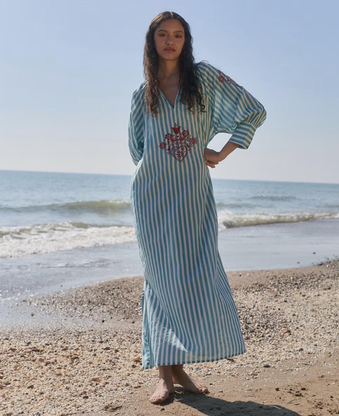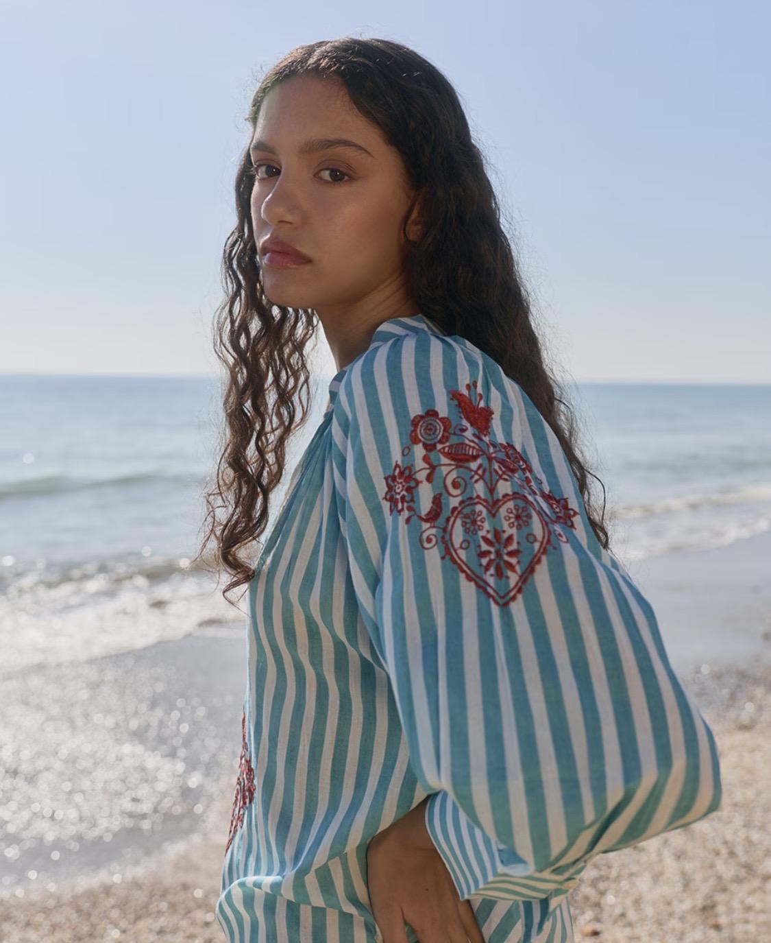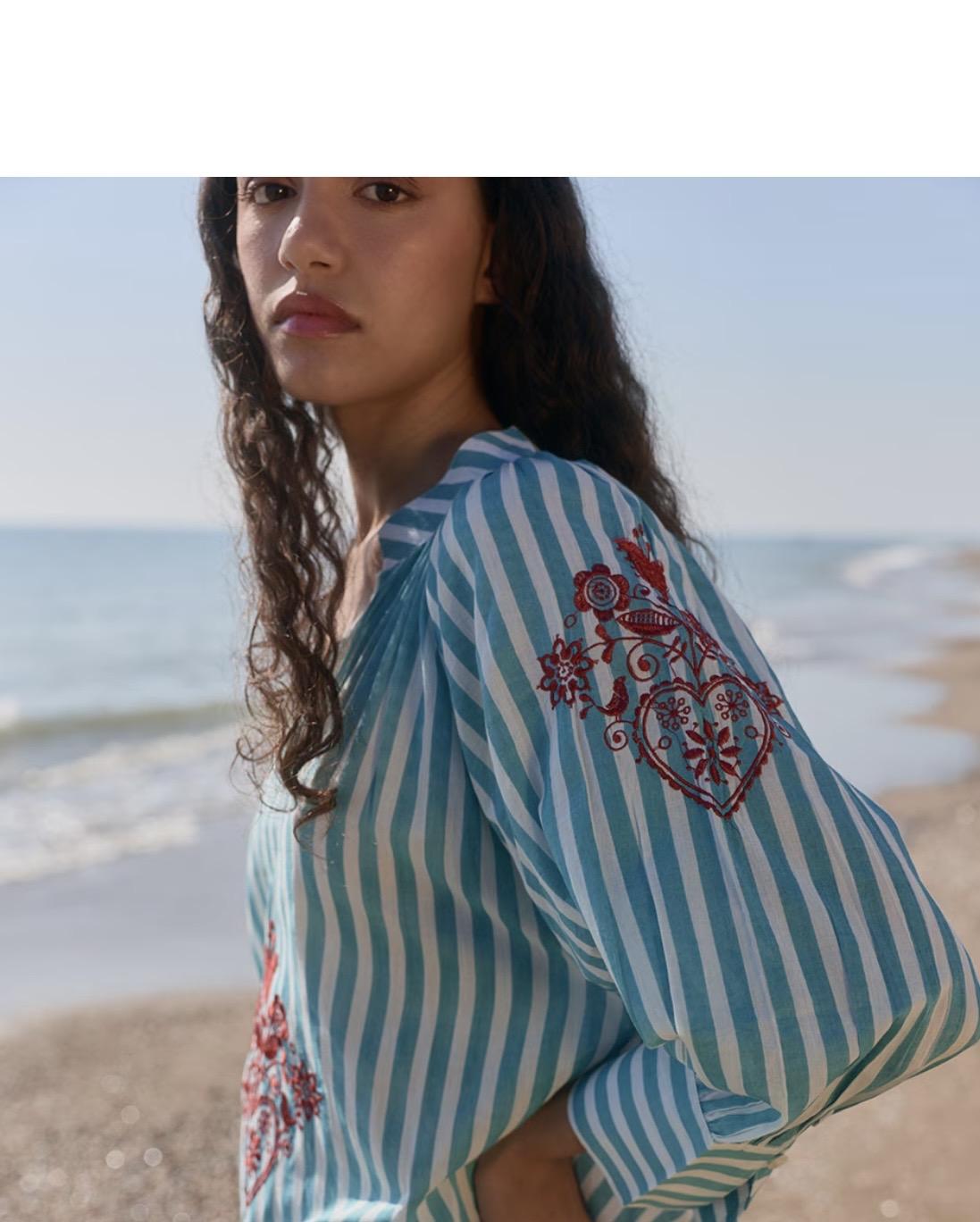 Tunica larga turquesa con bordados, escote V y manga francesa abullonada. Aberturas laterales y bolsillos.