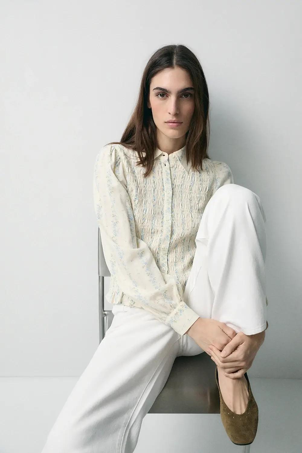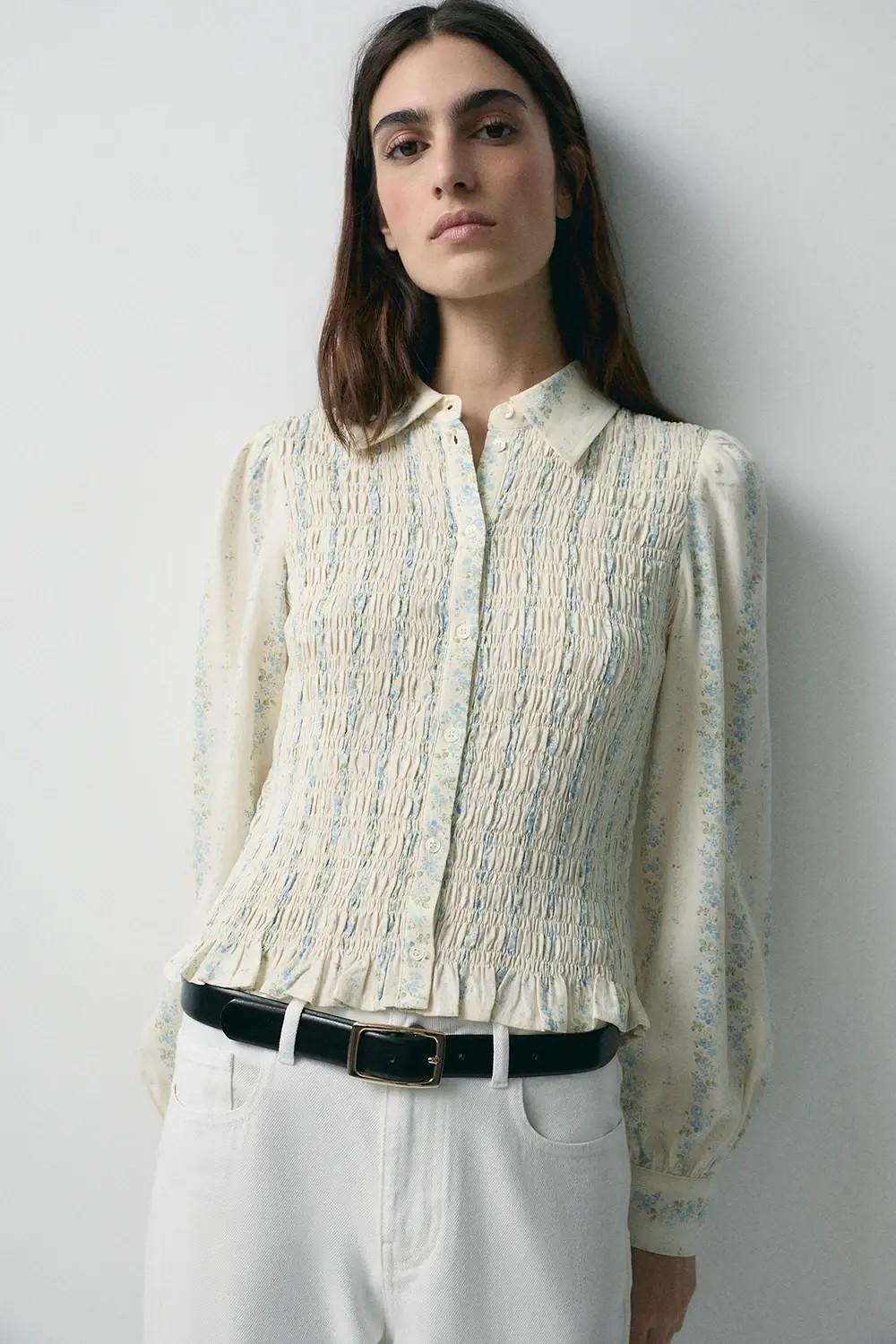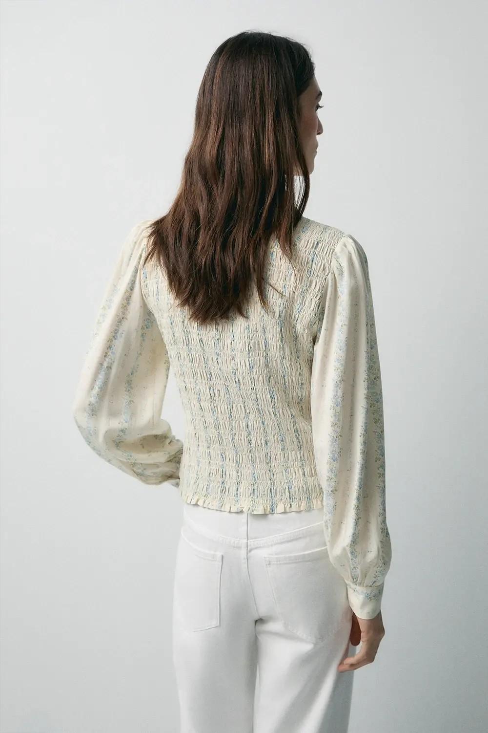 Camisa romántica con estampado. Cuello camisero. Manga abullonada. Tejido del cuerpo con fruncido en relieve. Largo prenda para talla S: 51 cm.