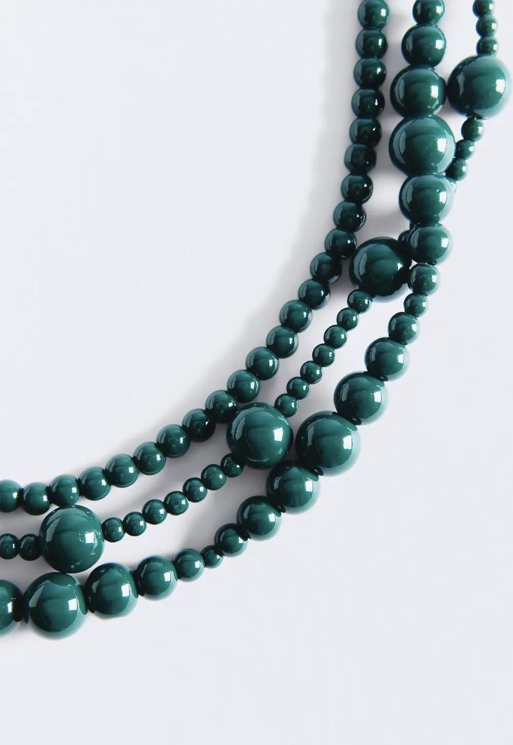Collar de bolas de diferente tamaño en color azul petróleo. Cierre de cadena con mosquetón. Medidas: 58 cm + 8 cm.