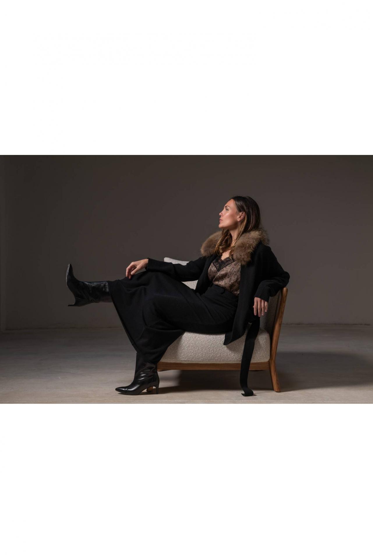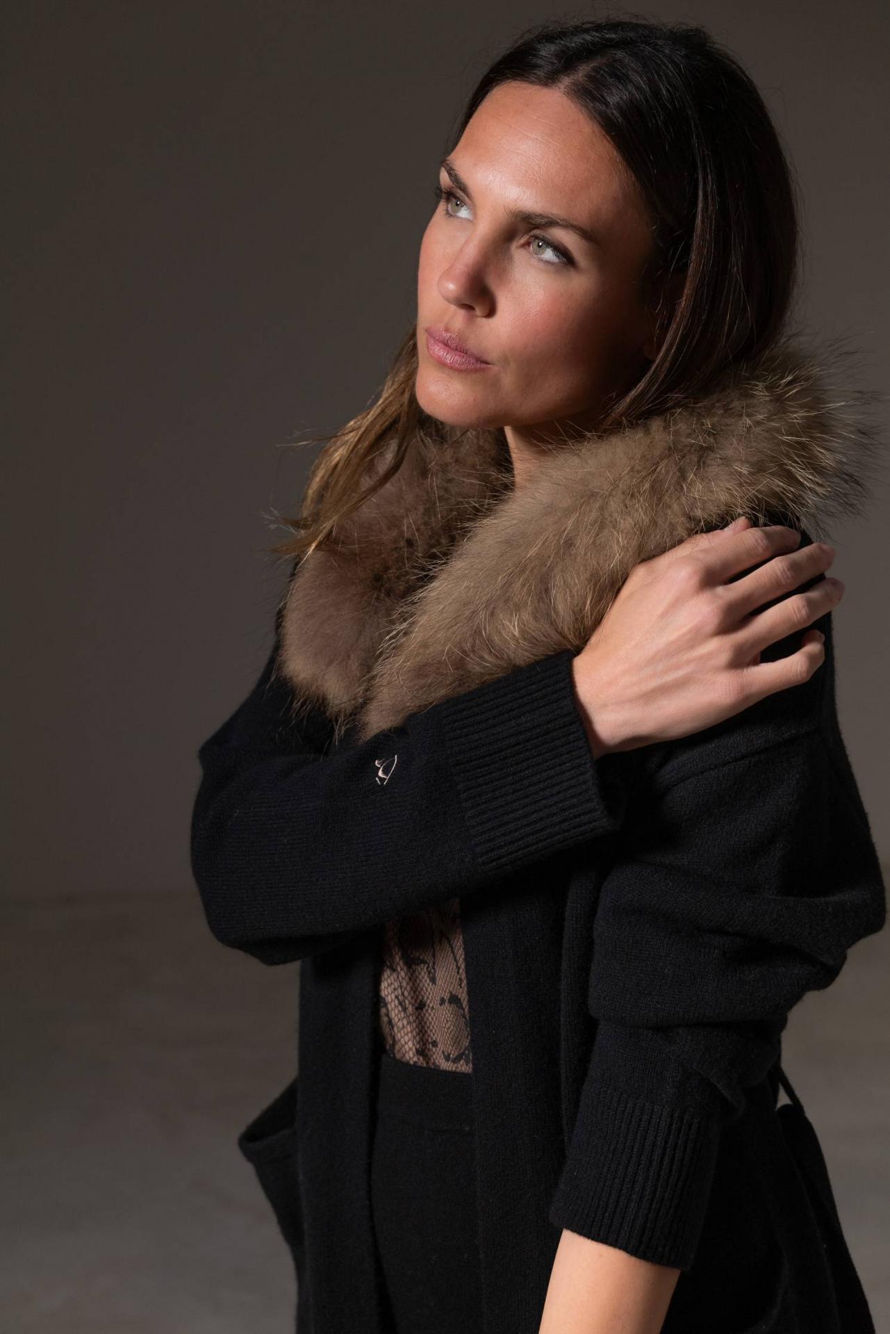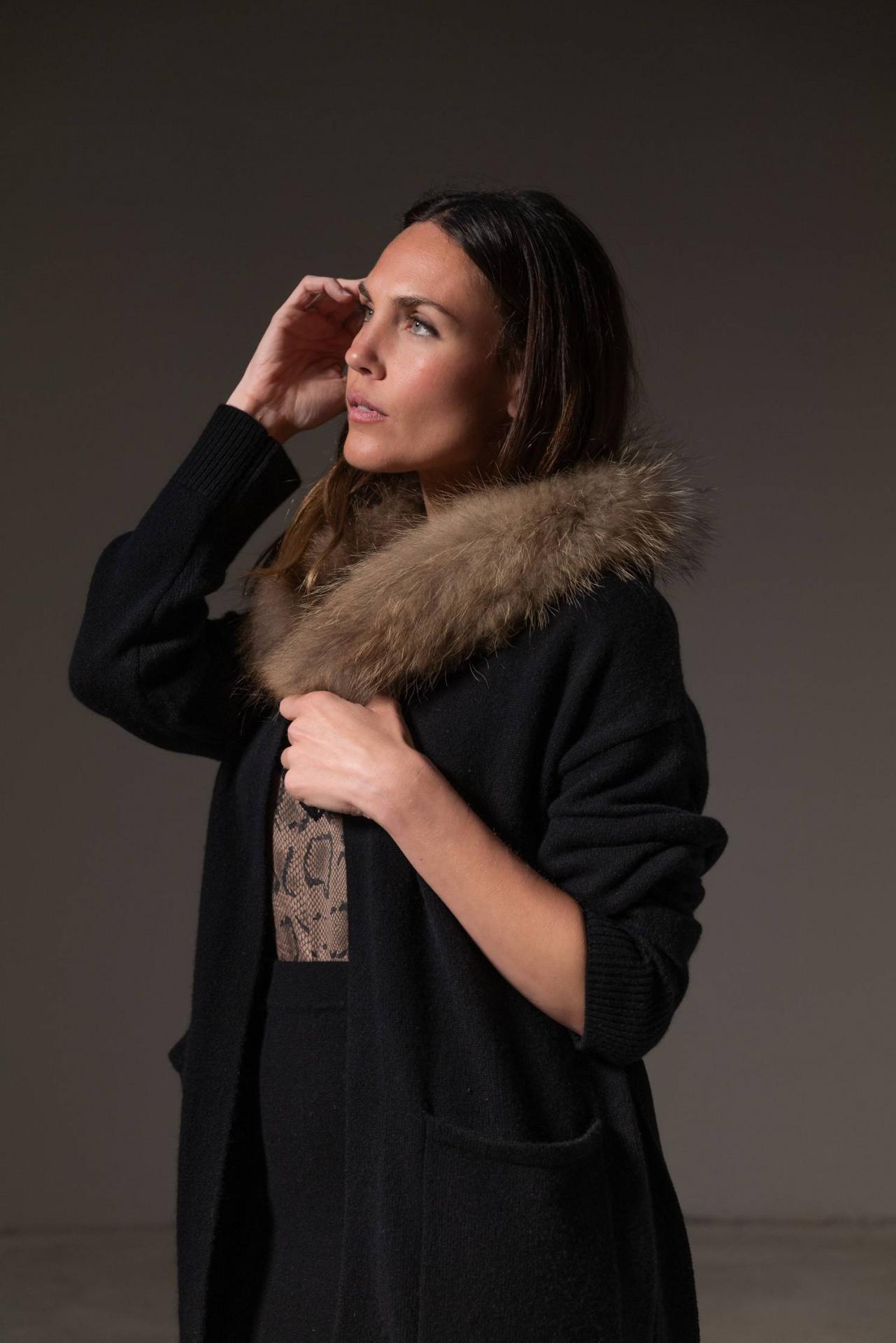 Cardigan de punto en cashmere con capucha de piel desmontable, bolsillos frontales y cinturón en el mismo punto. Combínalo con una de nuestras faldas. Tejido cálido y confortable. La fibra natural tiene gran capacidad de adaptarse a cada talla. Material: 30% cashmere y 70% lana 100% merino. Color: Ébano - Negro. . Cuidado de las prendas: Lavado a mano en frío o en programa para prendas delicadas. Planchado del revés y a baja temperatura. Largo desde el hombro: 80 cm en talla S.