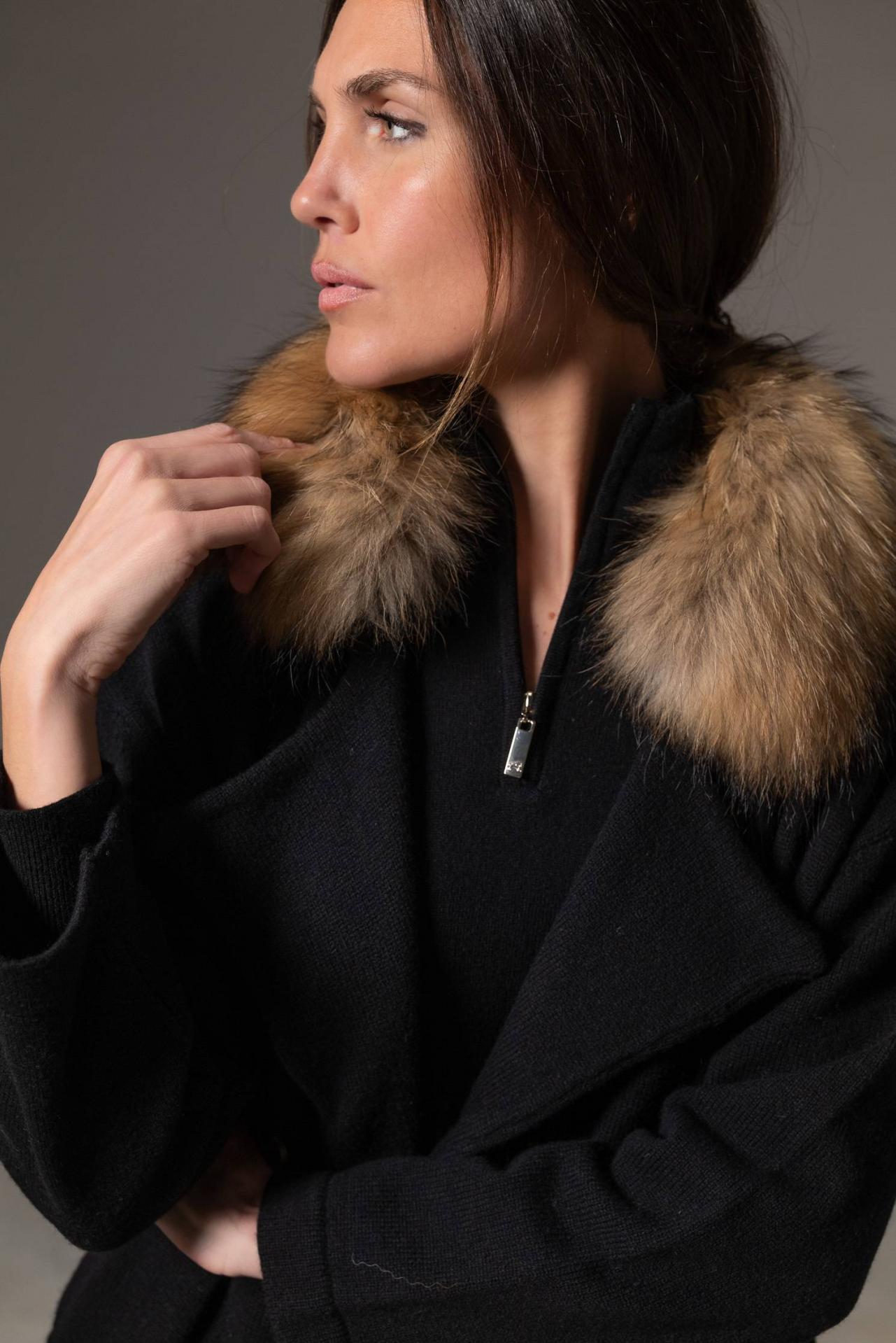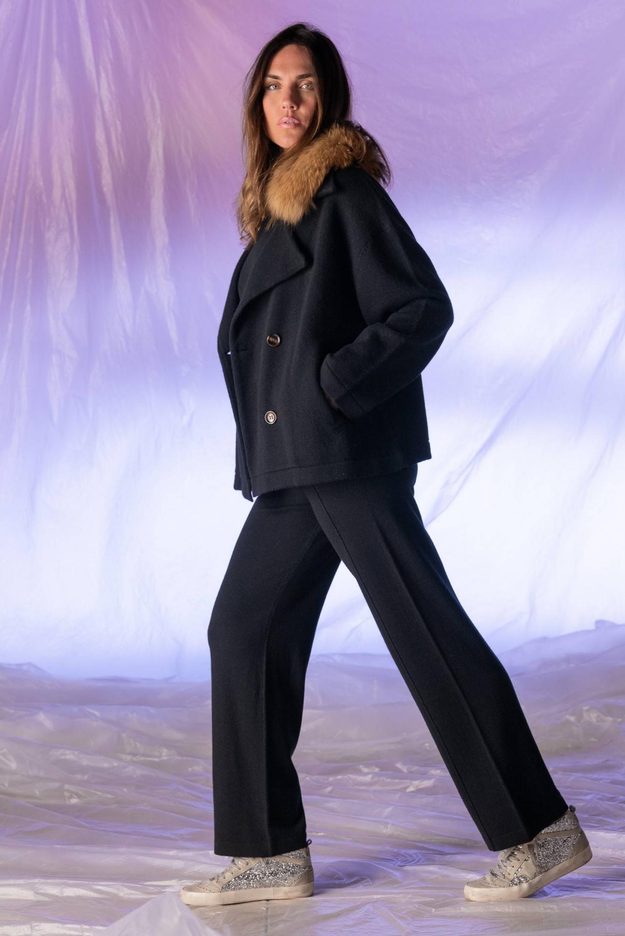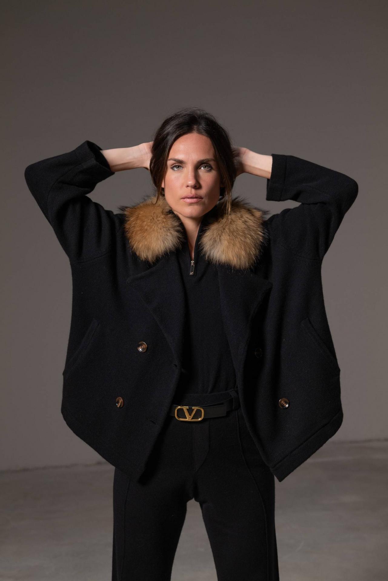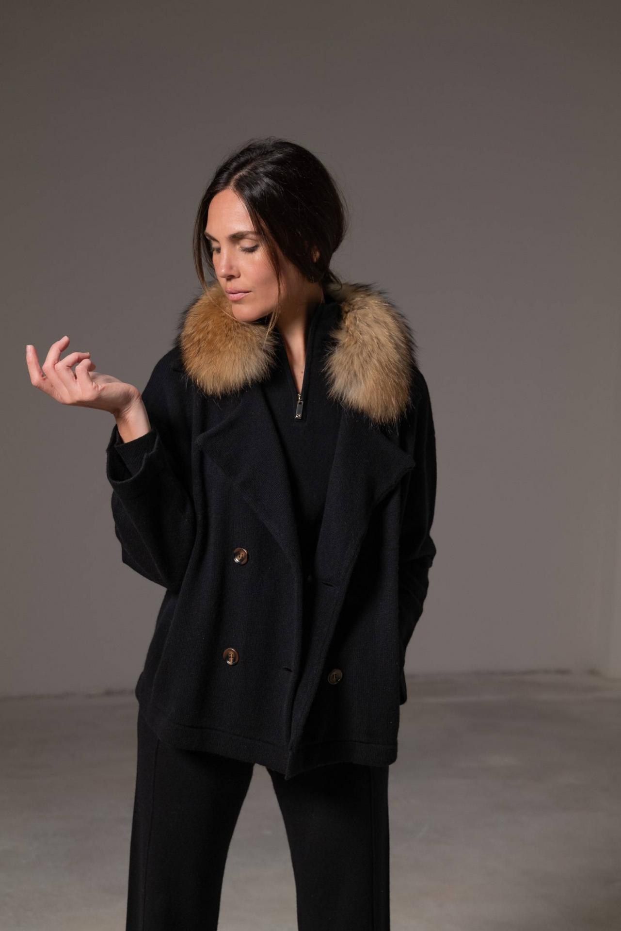 Abrigo corto confeccionado en cashmere. Añade un toque moderno y cómodo a tu vestuario con esta prenda cropped de súper tendencia. Con un mayor gramaje, conseguimos que sea una prenda muy cálida y confortable, gracias a su cierre de botones cruzados. La fibra natural tiene gran capacidad de adaptarse a cada talla. Un abrigo corto, que debe estar en la lista de tus prendas top de tu vestidor este invierno. Con el cuello de piel natural desmontable podrás personalizar tu look. Combínalo con nuestro pantalón en cashmere, una de nuestras faldas mini, o con nuestros vestidos de colección. Material: 30% cashmere y 70% lana 100% merino. Color: Ébano - Negro. Cuidado de las prendas: Lavado a mano en frío o en programa para prendas delicadas. Planchado del revés y a baja temperatura. Largo desde el hombro: 67 cm en talla S.