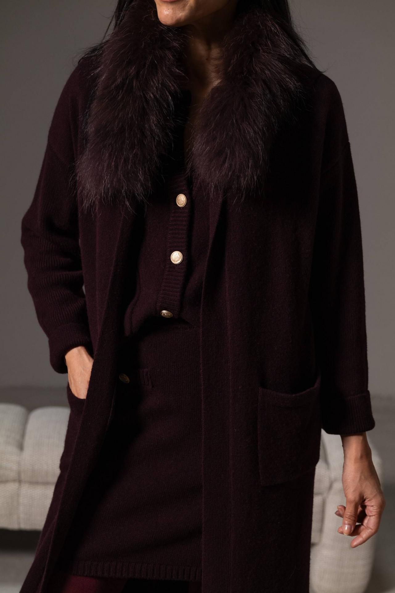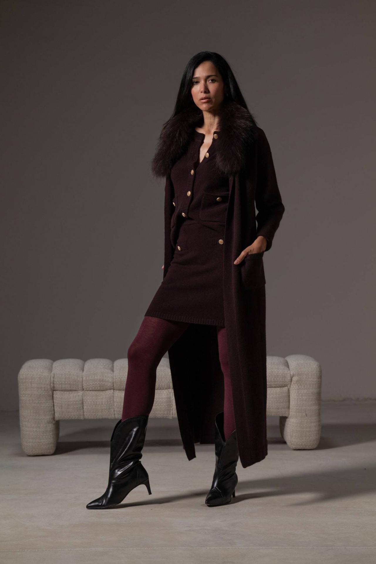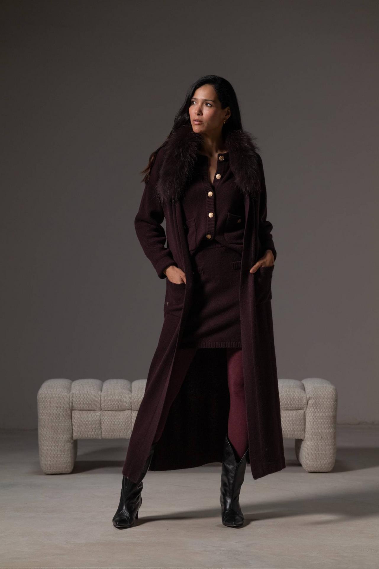 Abrigo largo de punto en cashmere con capucha y bolsillos delanteros. La manga va en punto canale. La capucha incluye tira de piel natural forrada y desmontable. Tejido cálido y confortable. La fibra natural tiene gran capacidad de adaptarse a cada talla. Material: 30% cashmere y 70% lana 100% merino. Cuidado de las prendas: Lavado a mano en frío o en programa para prendas delicadas. Planchado del revés y a baja temperatura. Largo desde el hombro: 150 cm en talla S.