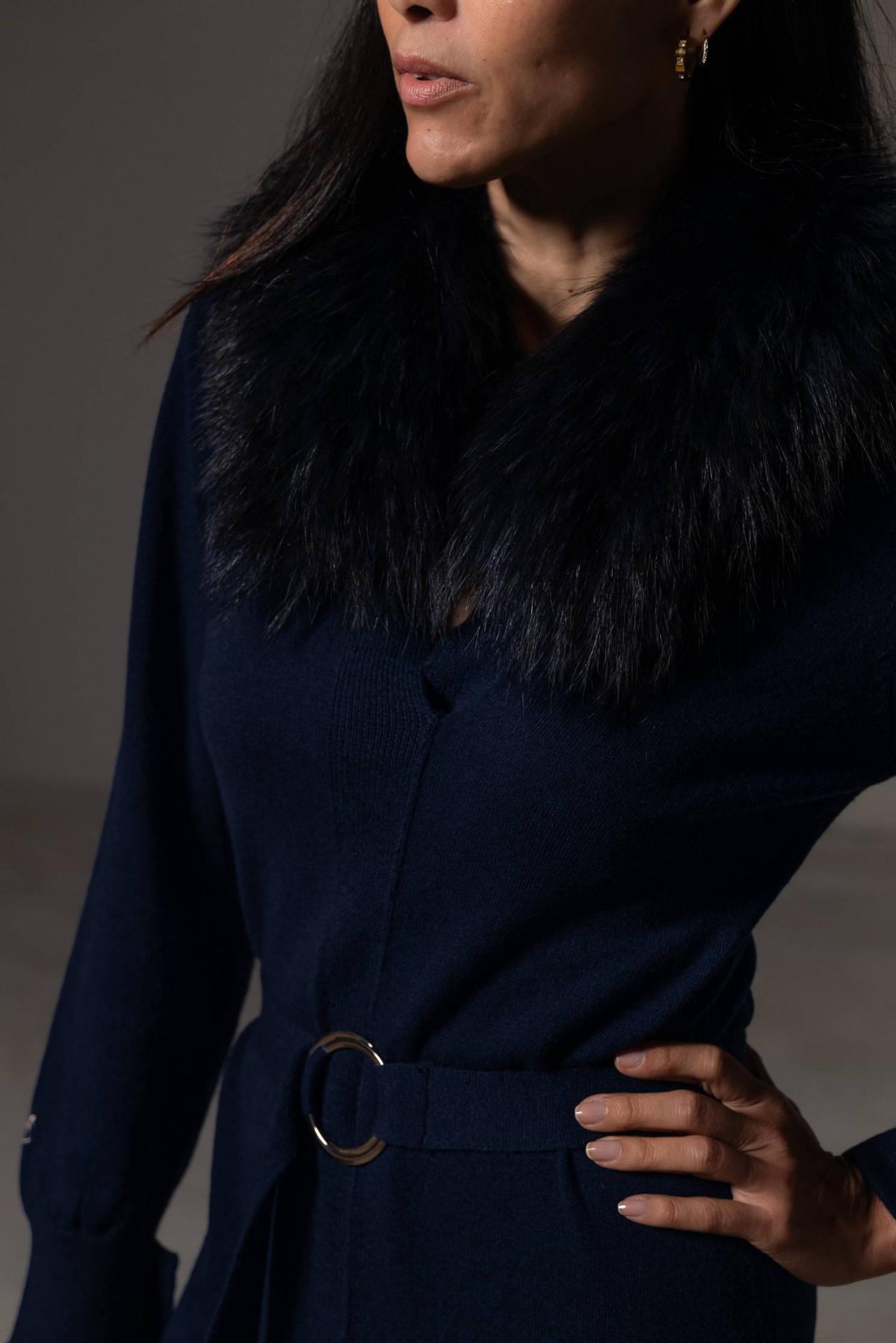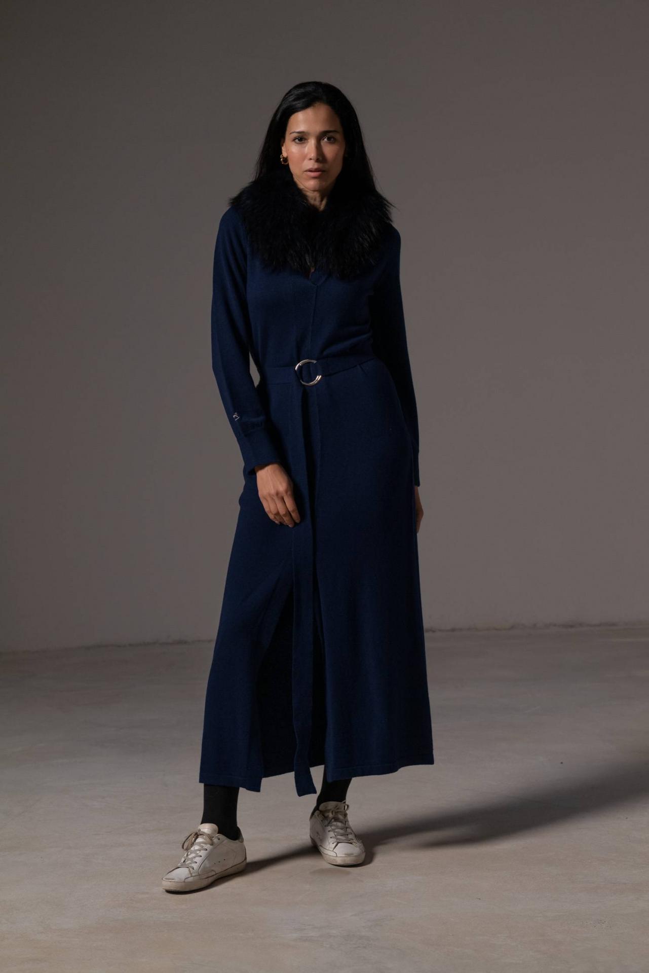 Nuestro clasico vestido camisero, ahora en punto cashmere. El modelo que realza tu figura. Lo complementamos con un cinturón del mismo tejido que te permitirá marcar tu cintura. Una abertura frontal con la que ganarás en estilo y comodidad. El cuello de piel es desmontable. Combínalo con nuestro abrigo cropped. La fibra natural tiene gran capacidad de adaptarse a cada talla. Material: 30% cashmere y 70% lana 100% merino. Cuidado de las prendas: Lavado a mano en frío o en programa para prendas delicadas. Planchado del revés y a baja temperatura. Largo desde el hombro: 140 cm en talla S.