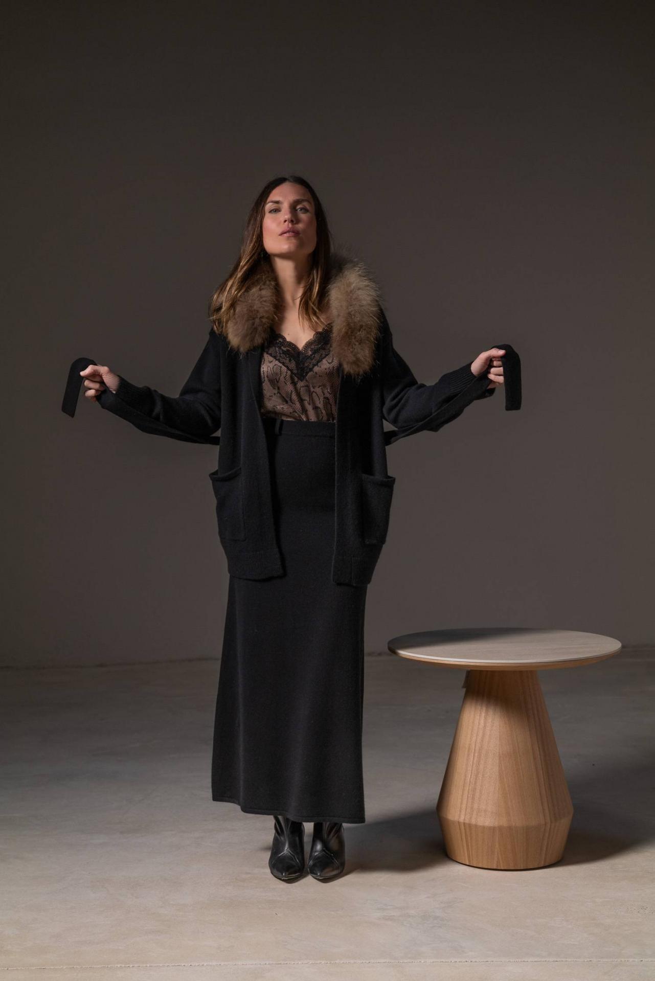 Siéntete cómoda y estilosa con esta falda en cashmere con un toque ebasé. Su cintura elástica es versátil para adaptarse a cualquier talla. Con sus trabillas, podrás utilizar tu cinturón favorito y elevar tu look. La largura desde la cintura es de 100 cm en la talla S. La fibra natural tiene gran capacidad de adaptarse a cada talla. Combínala con el cárdigan joya y consigue un total look de cashmere muy elegante y actual. Material: 30% cashmere y 70% lana 100% merino. Color: Ébano - Negro. Cuidado de las prendas: Lavado a mano en frío o en programa para prendas delicadas. Planchado del revés y a baja temperatura.