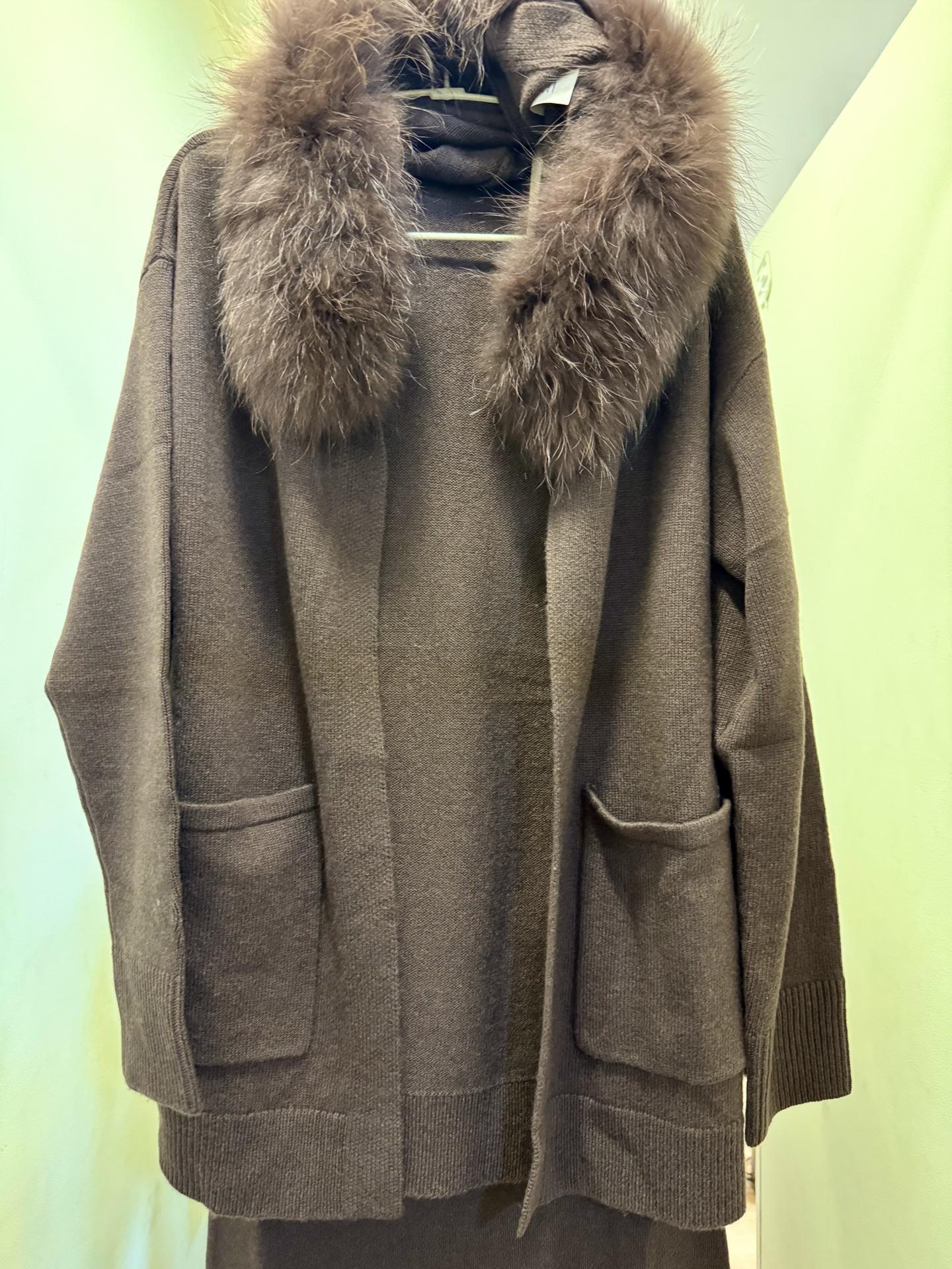 Cardigan de punto en cashmere con capucha de piel desmontable, bolsillos frontales y cinturón en el mismo punto. Combínalo con una de nuestras faldas. Tejido cálido y confortable. La fibra natural tiene gran capacidad de adaptarse a cada talla. Material: 30% cashmere y 70% lana 100% merino. Cuidado de las prendas: Lavado a mano en frío o en programa para prendas delicadas. Planchado del revés y a baja temperatura. Largo desde el hombro: 80 cm en talla S.