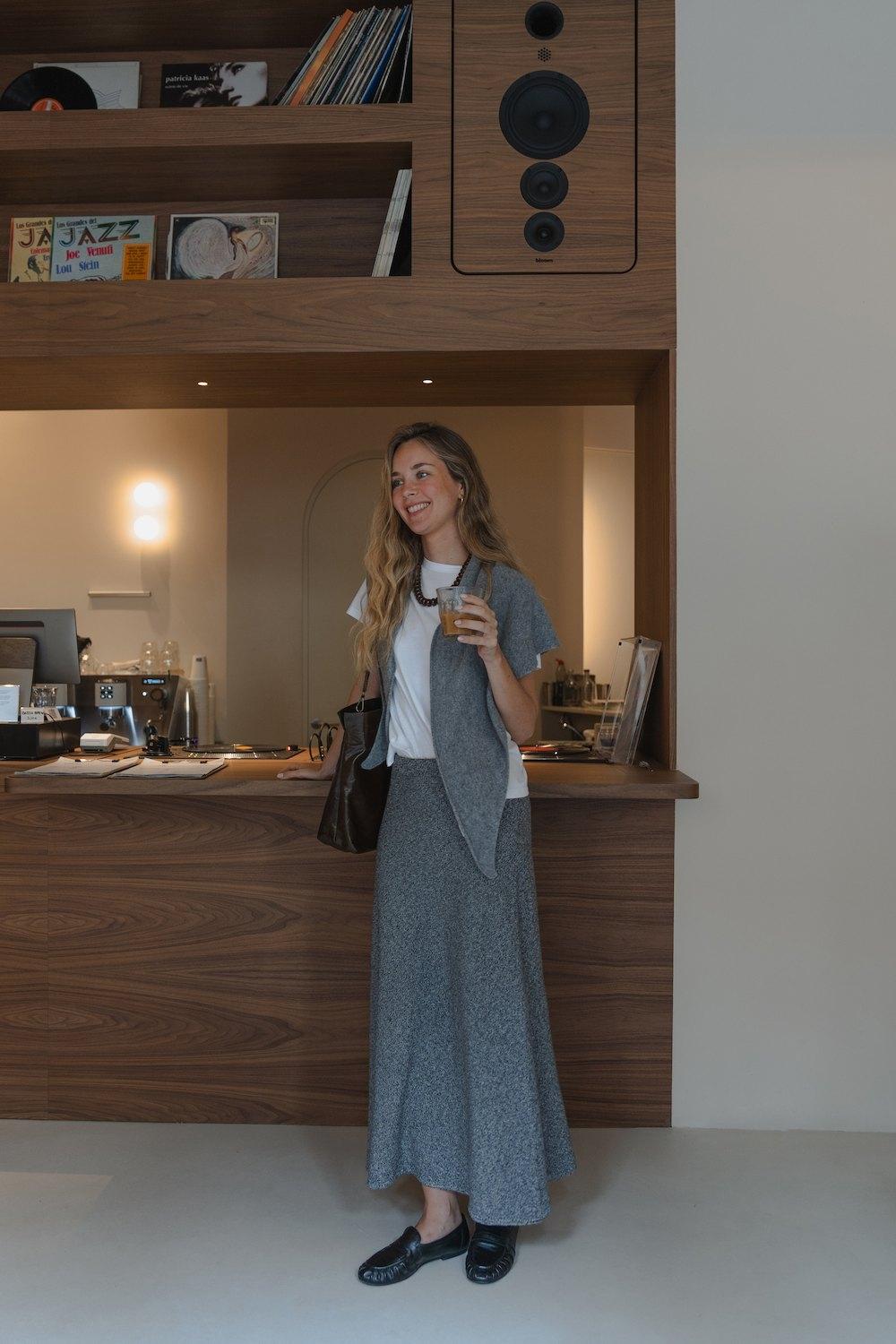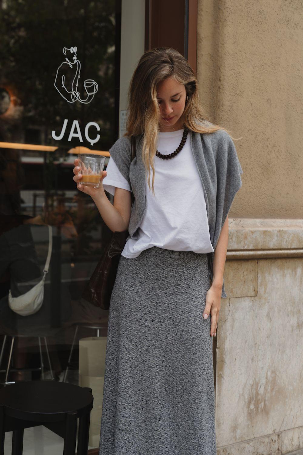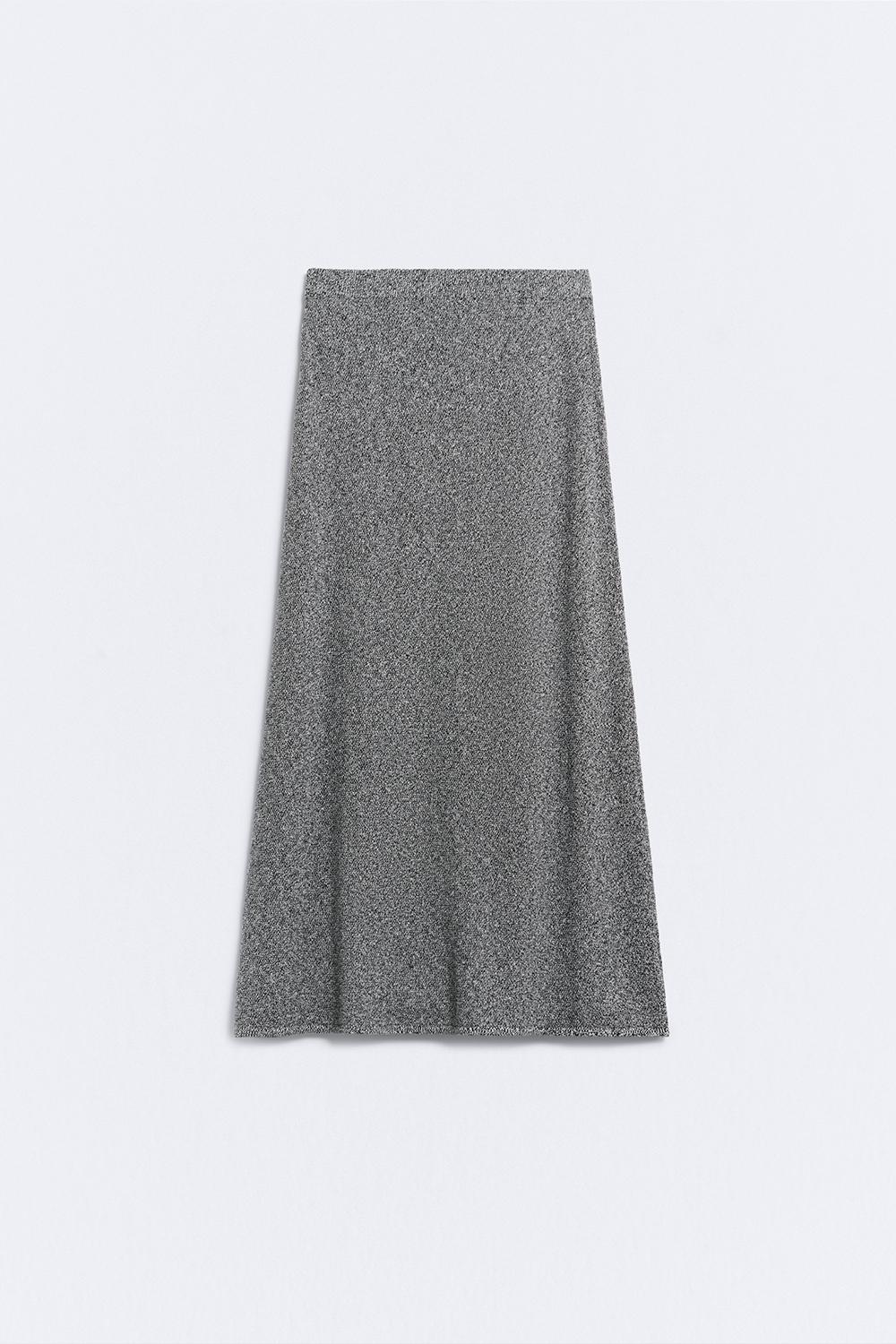 Falda midi evasé bicolor. Costura con puntadas pequeñas y agrupadas, tipo rice. Efecto jaspeado. Goma en la cintura. Tejido elástico. Sin cierre. Largo prenda para talla S: 87 cm
