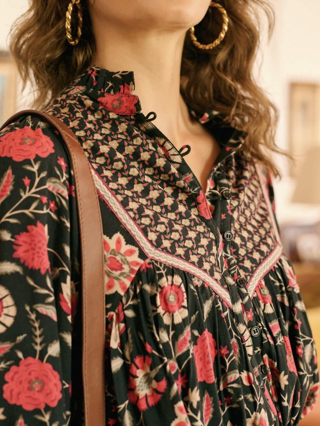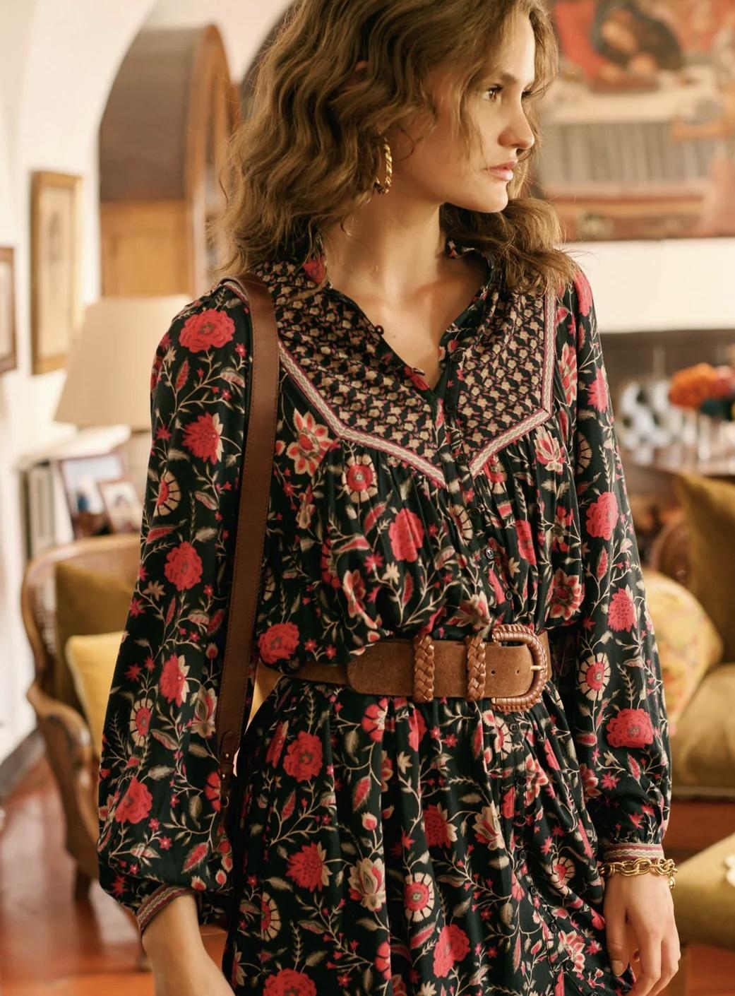 Por qué nos encanta: Este vestido con estampado floral seduce por su estilo bohemio y su abertura abotonada. Confeccionado en un tejido suave y ligero, ofrece una comodidad óptima para el día a día. Se puede llevar con el cinturón ADELE de ante natural para una silueta más estructurada o suelto para un toque más informal, adaptándose a todos tus deseos.