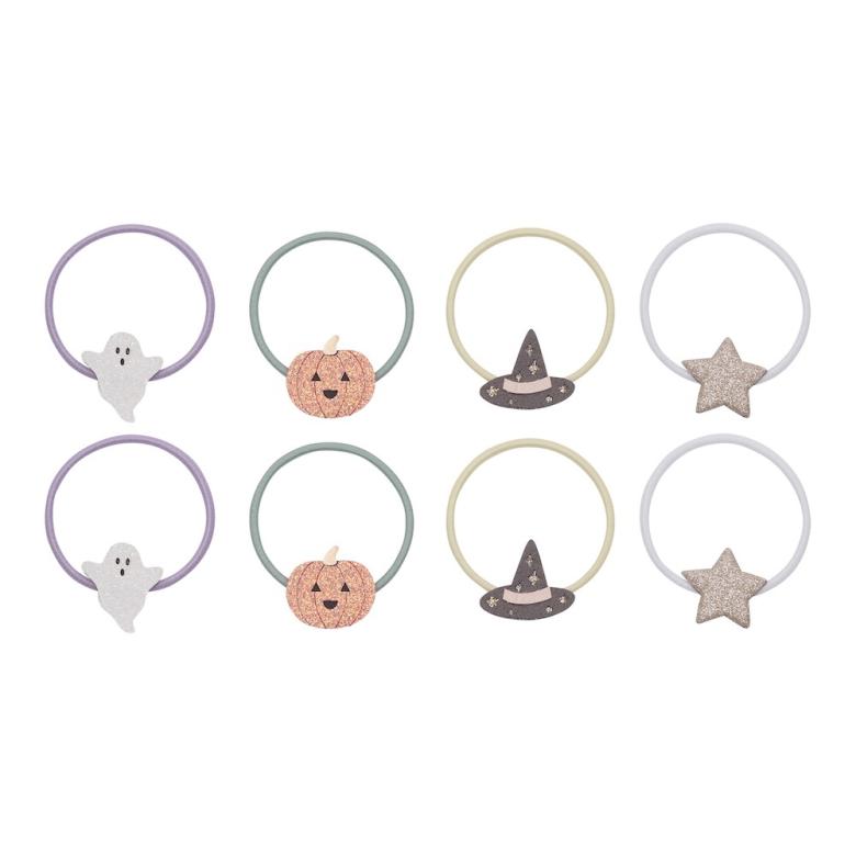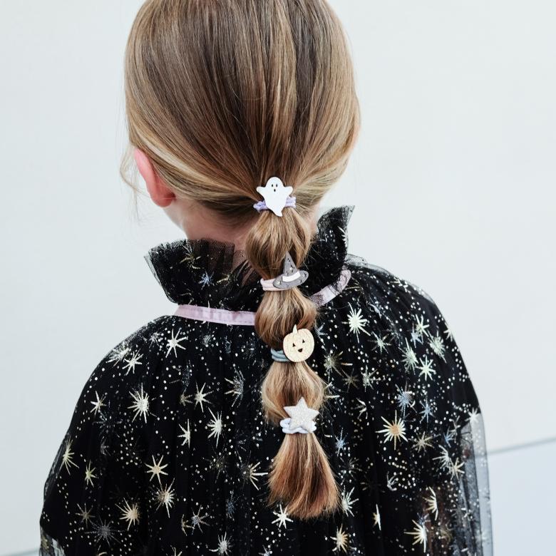 Este brillante paquete de ocho coleteros es perfecto para crear todo tipo de estilos espeluznantes. Elaborados con suaves telas brillantes y fijados con bonitos elásticos en tonos pastel, ¡son la combinación perfecta de terror y encanto! 8 por paquete. Elásticos resistentes de 5 cm en bonitos tonos pastel que contrastan. Fantasmas, calabazas, sombreros y estrellas, todos elaborados con una mezcla de suave antelina y telas brillantes.