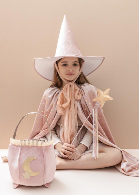 ¡Presentamos nuestra preciosa capa de bruja con lazo Glinda! Una capa de terciopelo supersuave en un precioso tono rosa. ¡Combínala con nuestro sombrero de bruja con lazo Glinda a juego para un look realmente fascinante! Talla para niños de 3 a 10 años. Terciopelo rosa supersuave, adornado con un estampado dorado de lunas y estrellas, con un lazo extragrande de tul suave y forro de satén. Cierre con botones a presión. Seguridad probada. Limpieza solo con un paño.
