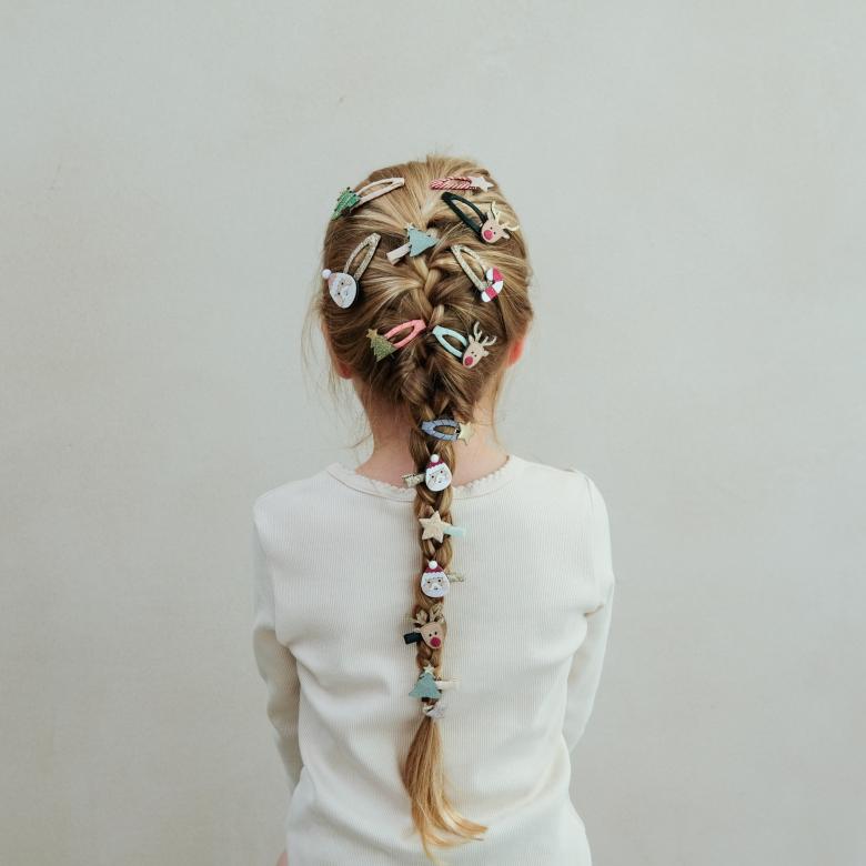 Dale un toque navideño a su cabello con este alegre pack de cuatro pinzas. Incluye dos Papá Noeles con mejillas sonrosadas y dos árboles con estrellas brillantes en la punta. ¡Son perfectas para regalar sonrisas navideñas! 4 pinzas clic-clac de 5 cm envueltas en cinta brillante. Papá Noeles y árboles de Navidad elaborados con una mezcla de antelina suave, purpurina fina y telas metálicas.