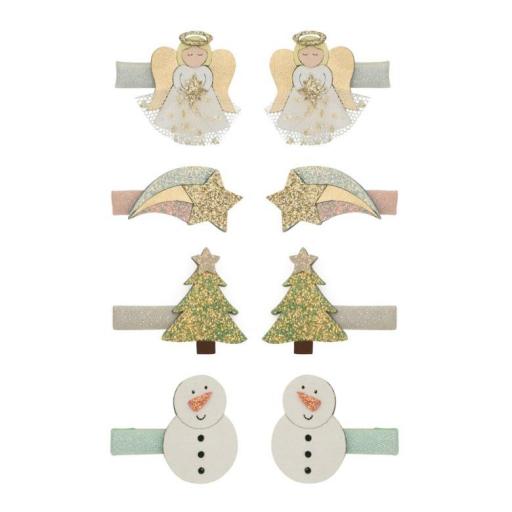 Dale un toque angelical al cabello de tu pequeña con este adorable y brillante paquete de ocho pinzas. Perfectas para crear peinados súper dulces esta Navidad. 8 pinzas de cocodrilo de 3 cm envueltas en cinta. Ángeles, árboles de Navidad, estrellas fugaces y muñecos de nieve elaborados con una delicada mezcla de telas con purpurina fina, metalizadas y antelina, con suaves faldas de ángel de tul moteado con purpurina.