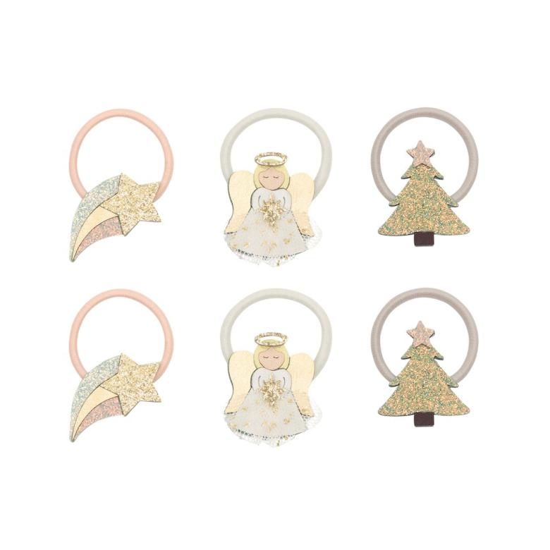 Dale un toque angelical al cabello de tu peque con este adorable y brillante pack de seis mini ponis. Perfecto para crear peinados súper dulces esta Navidad. 6 por pack. Ángeles, árboles de Navidad y estrellas fugaces, elaborados con una delicada mezcla de telas con purpurina fina, metalizadas y antelina, con suaves faldas de ángel de tul moteado con purpurina. Elásticos resistentes de 3 cm.