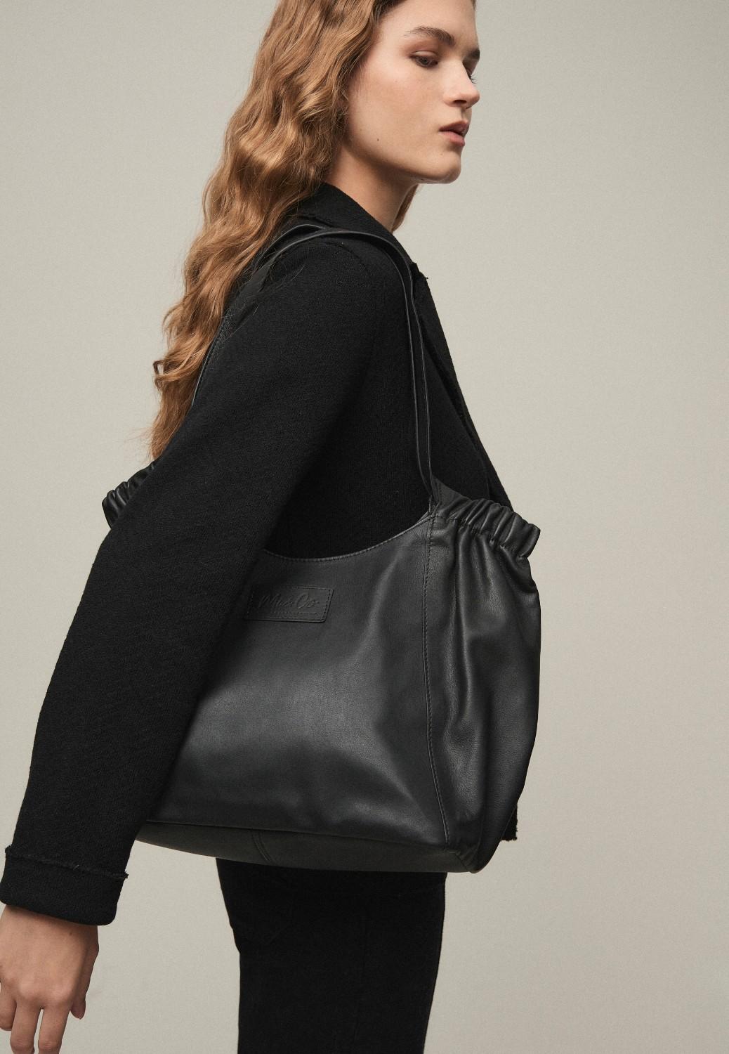 Shopping bag de piel. Laterales con detalle de arrugado, cierre mediante imán. Interior forrado a tono con bolsillo de cremallera. Medidas: 36cm largo, 25cm alto,15cm ancho, 52cm asas.