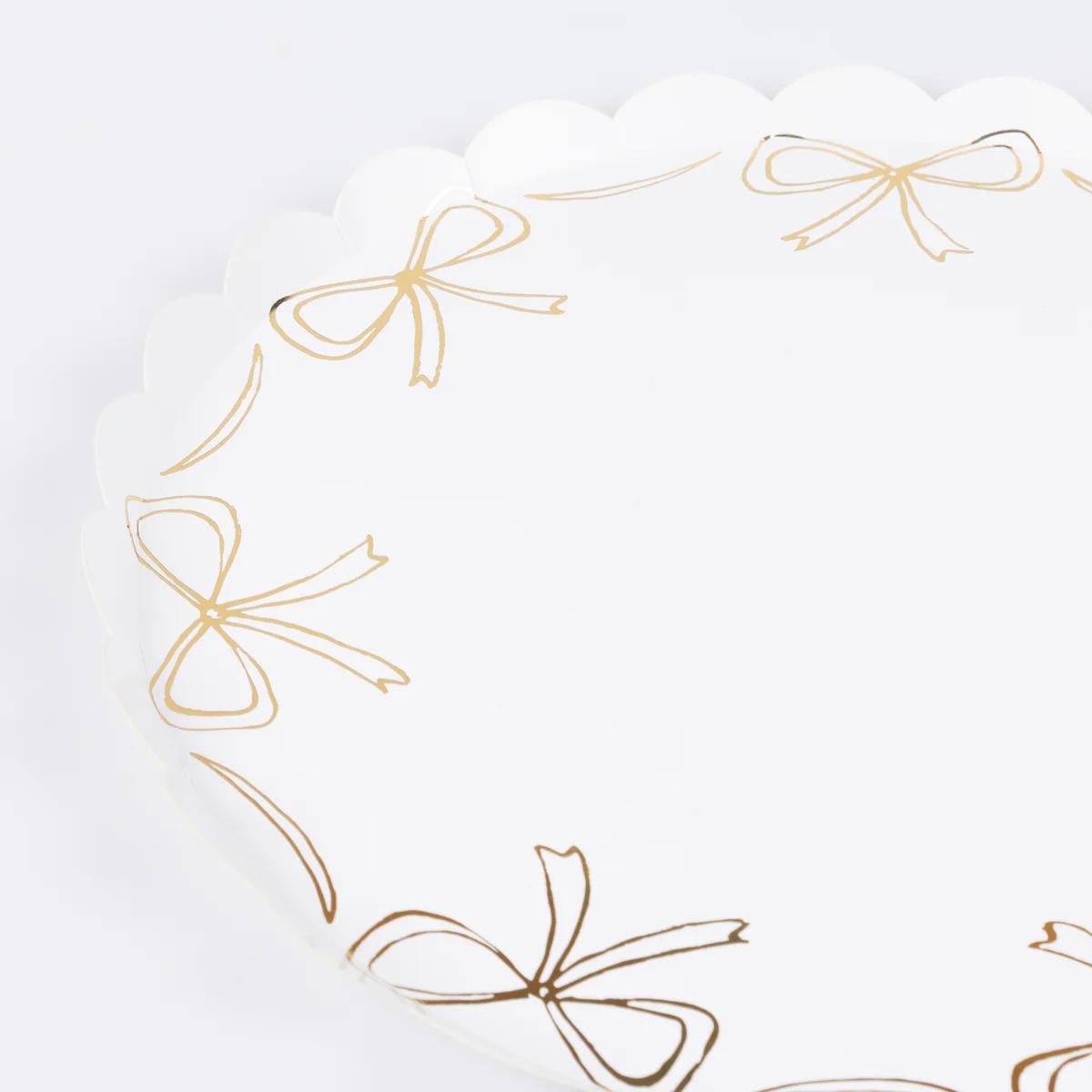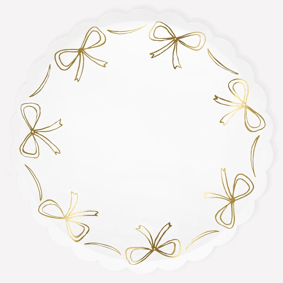 Dale un toque especial a tu fiesta con estos elegantes platos de papel. La combinación de lazos dorados y borde festoneado garantiza un toque sofisticado y natural a tu mesa, haciendo que cada detalle brille. Los platos desechables nunca han sido tan elegantes y son perfectos para toda la familia. Ideales para Navidad, Año Nuevo, bodas de oro, despedidas de soltera y cumpleaños especiales.