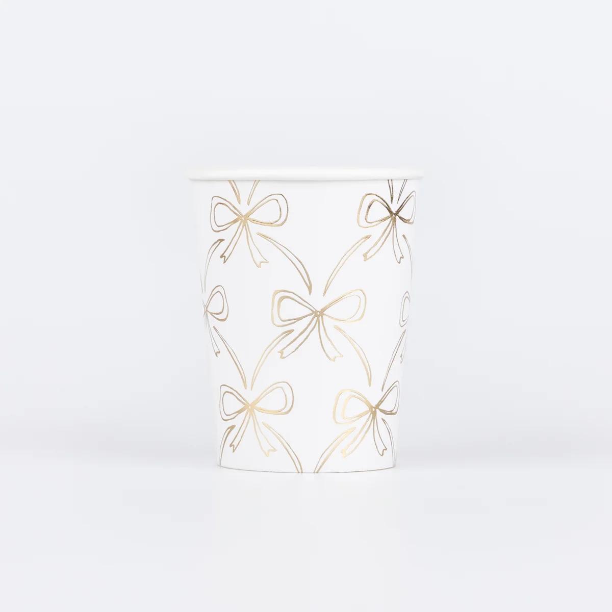 Dale un toque especial a tu fiesta con estos elegantes vasos de papel. Su diseño con lazo dorado le dará un toque sofisticado y natural a tu mesa, haciendo que cada detalle brille. Los vasos desechables nunca han sido tan elegantes y son perfectos para toda la familia. Ideales para Navidad, Año Nuevo, bodas de oro, despedidas de soltera y cumpleaños especiales.