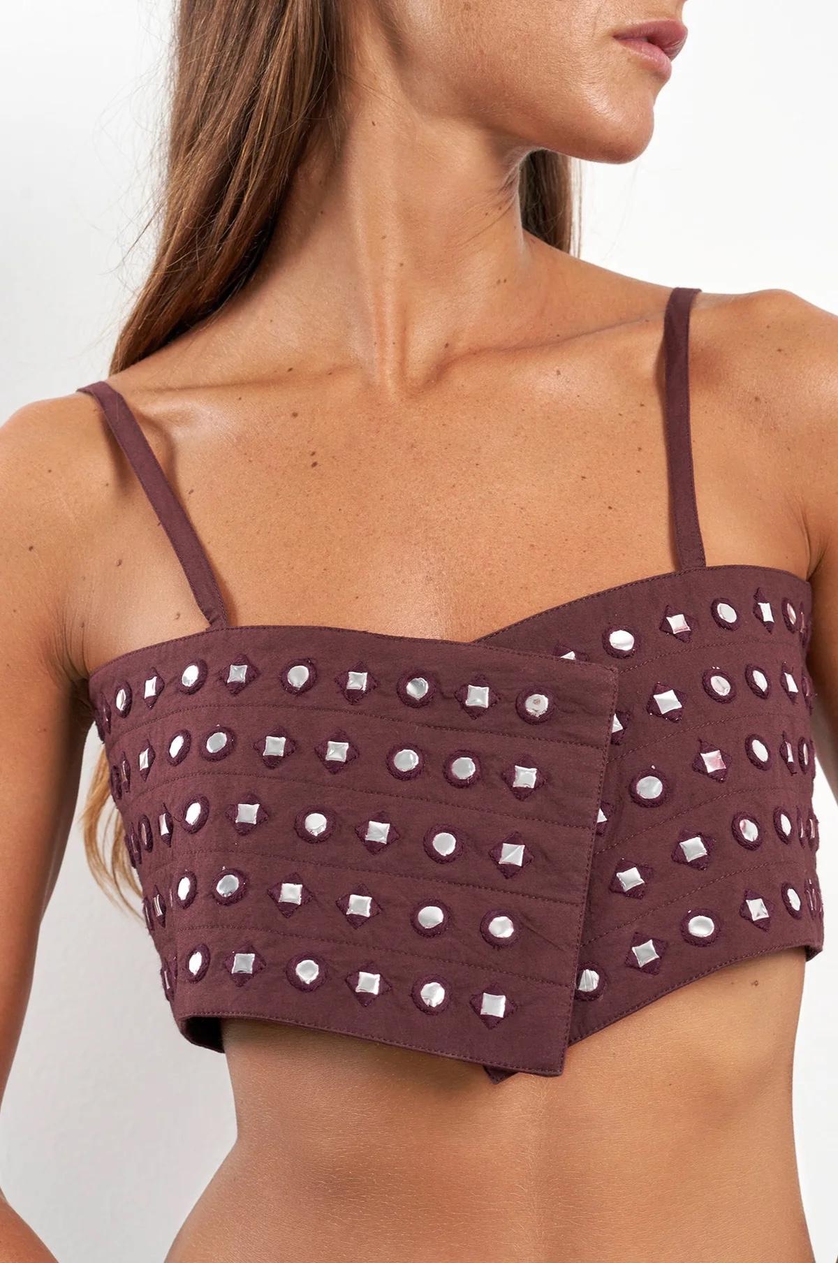 Top con espejos bordados en color marrón. Cierre delantero con snaps.