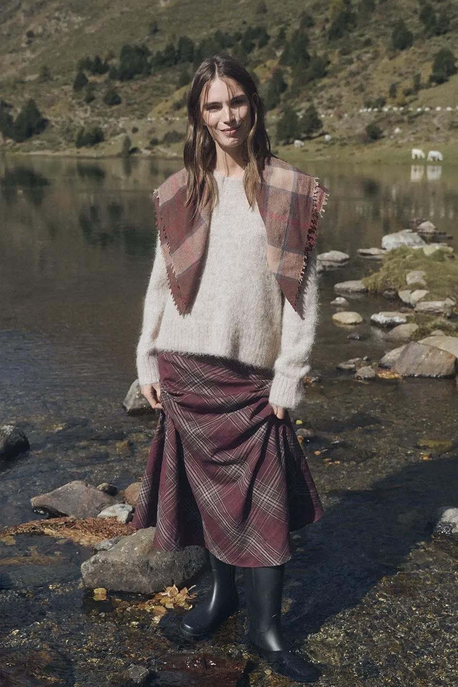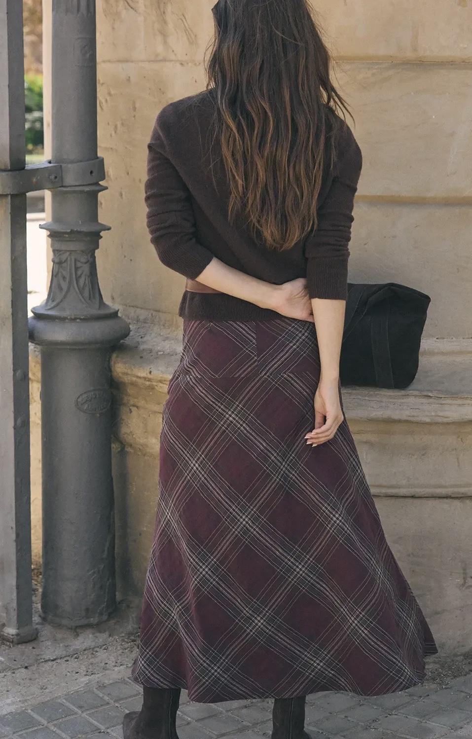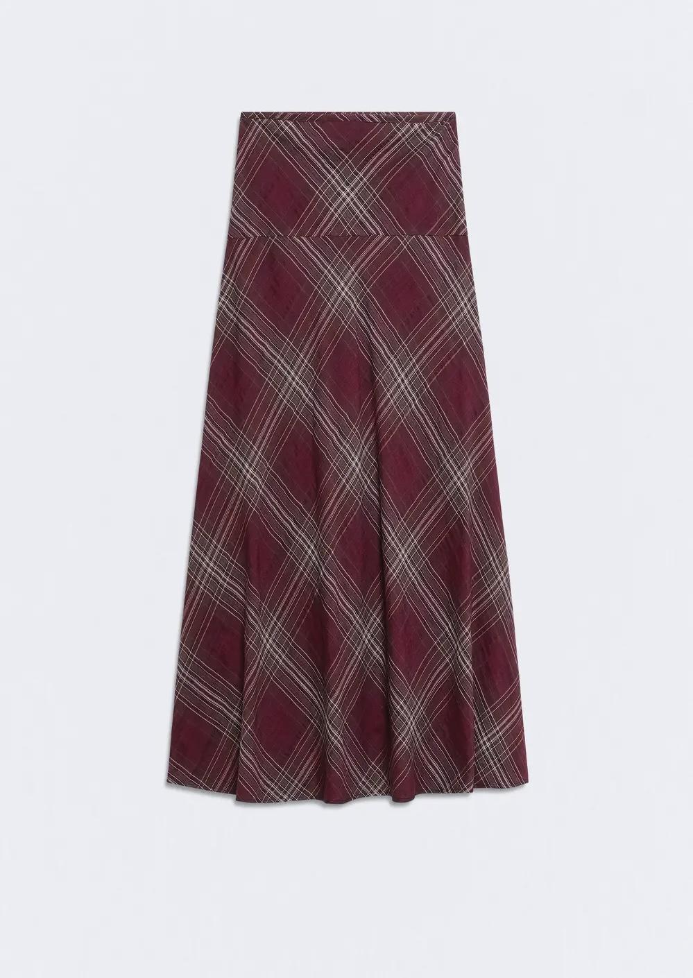 Falda larga de cuadros con mezcla de algodón orgánico. Parte superior entallada y falda con volumen. Con forro interior. Cierre con cremallera lateral. En color vino. Largo prenda para talla S: 95,5 cm.
