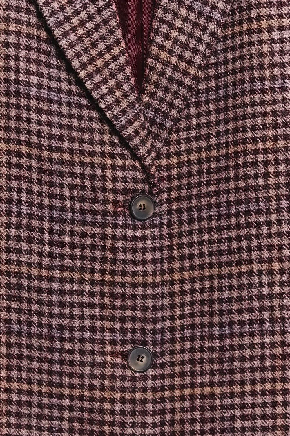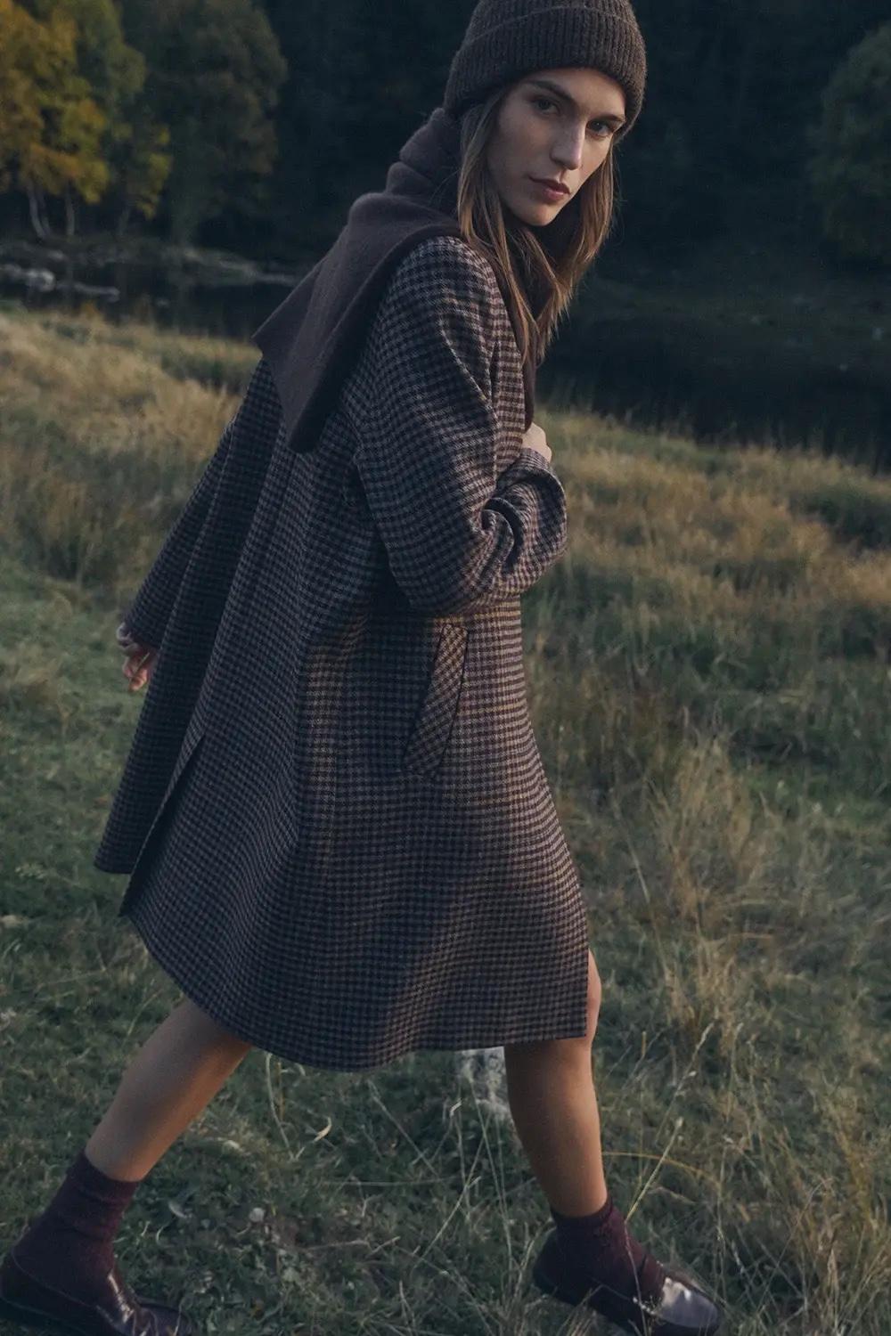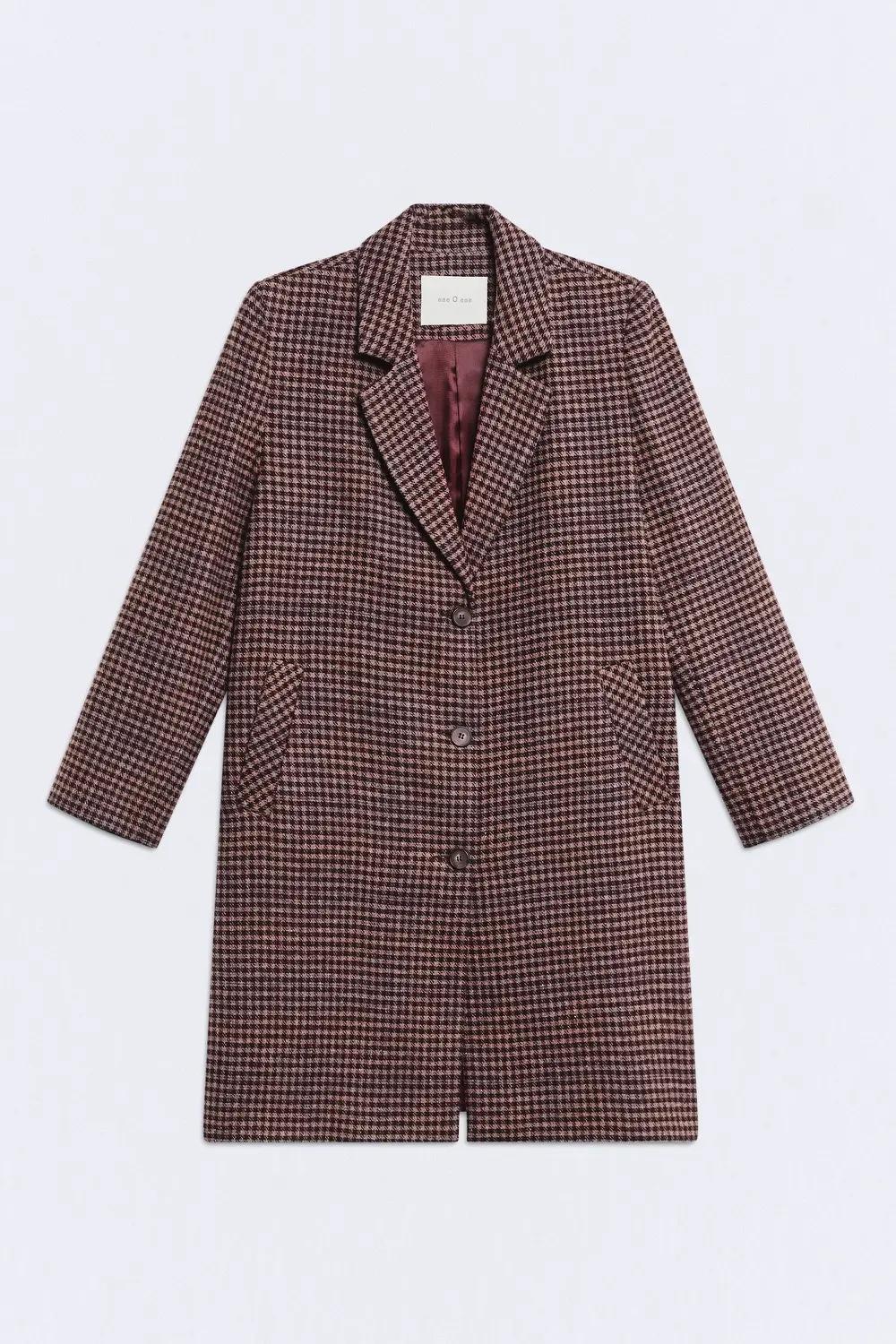Abrigo largo de lana con estampado de cuadros, cuello de solapa, abotonadura central.