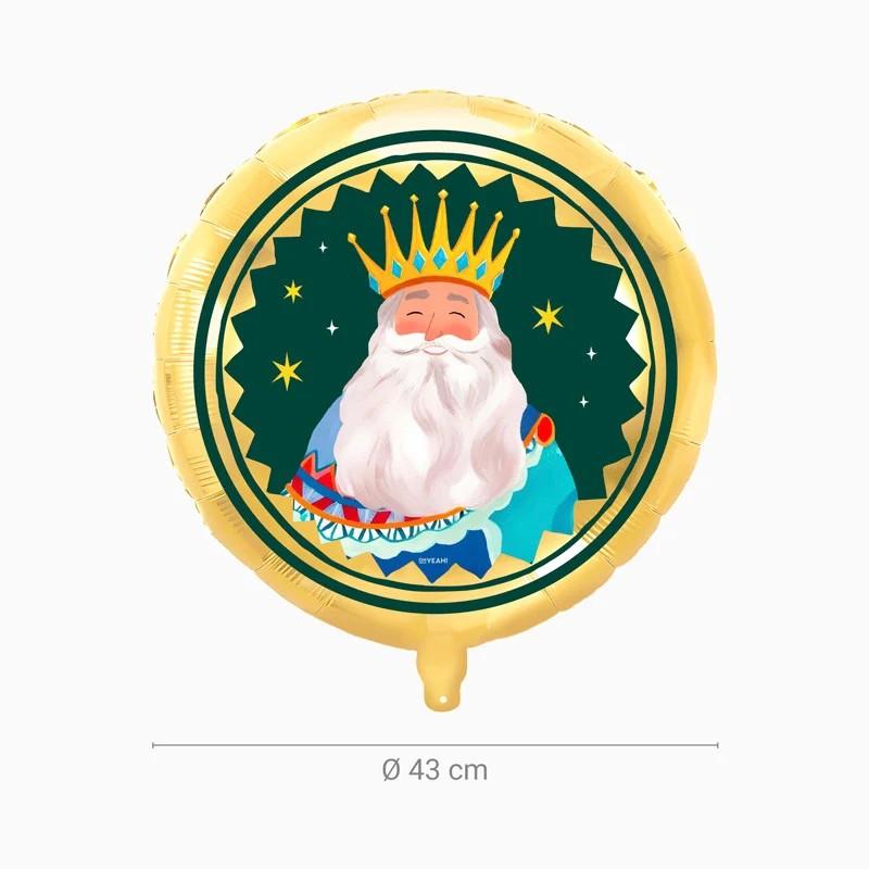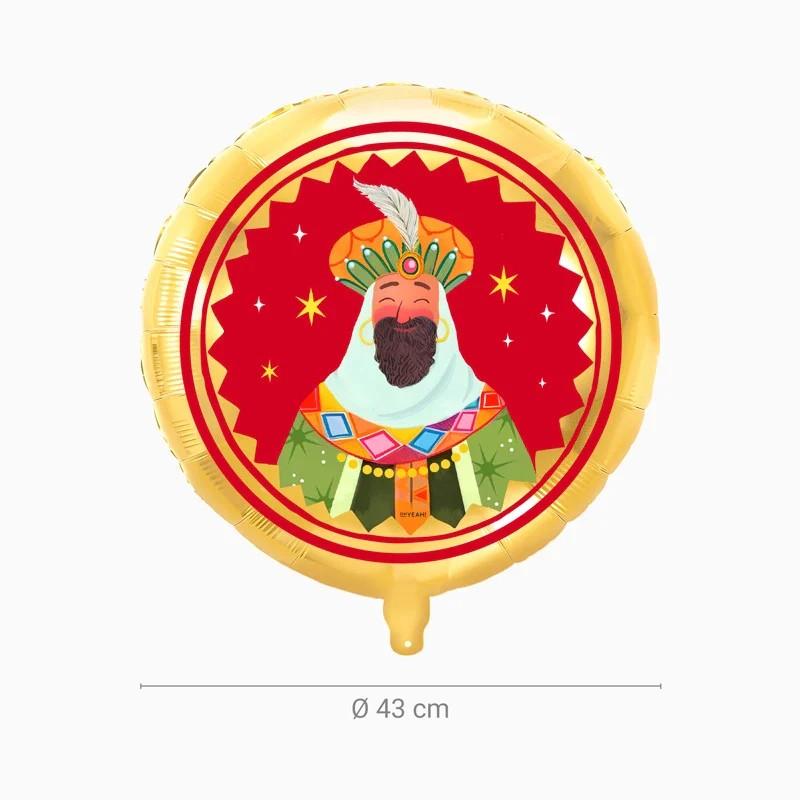 Set de globos foil redondos de Ø 43 cm decorados con motivos de los Reyes Magos en rojo navidad, azul marino, verde oscuro y dorado. Perfectos para ambientar cualquier fiesta temática navideña con un toque elegante y festivo.