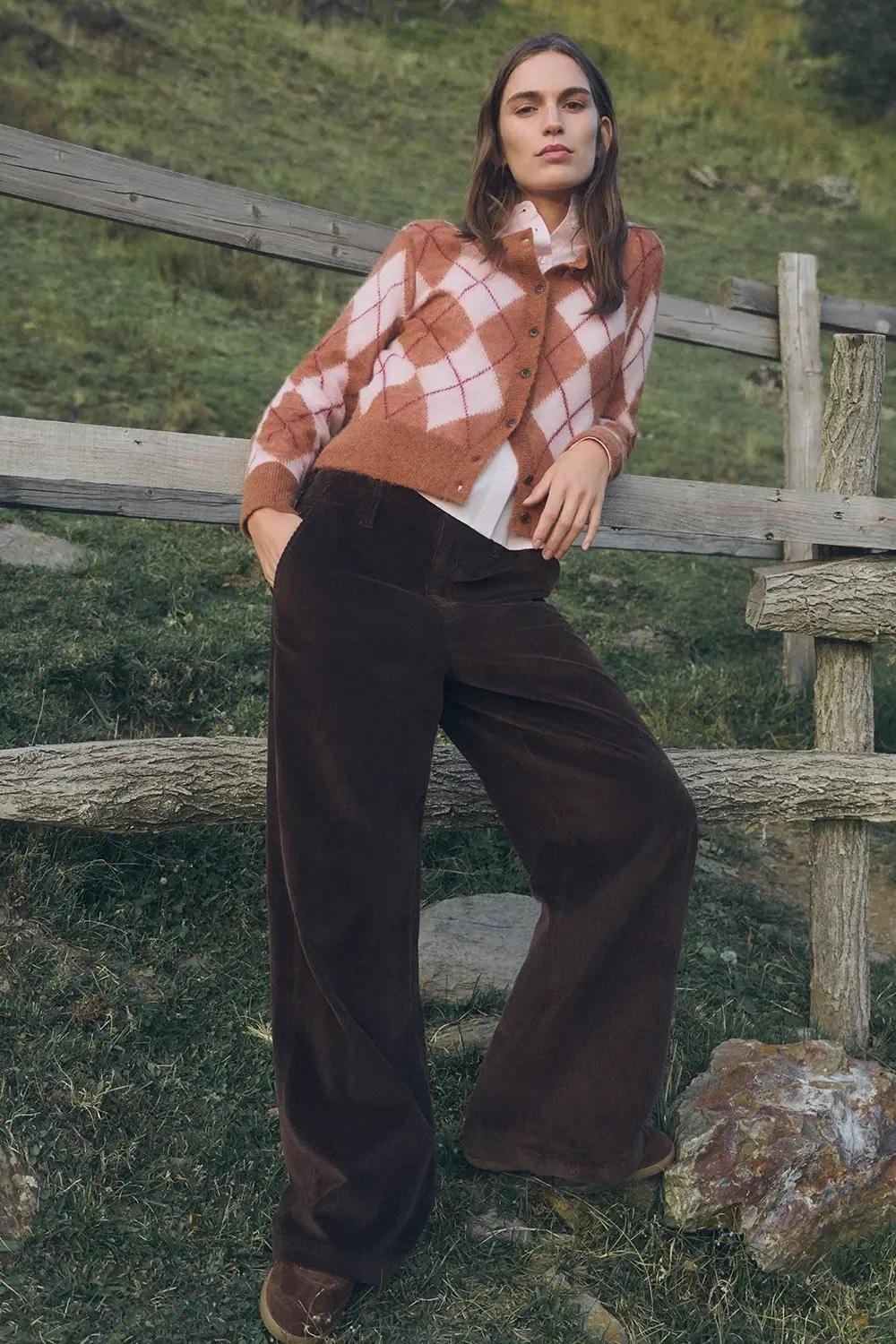 Cárdigan de punto con patrón geométrico de rombos. Tejido con composición de lana de alpaca. En color rosa y caramelo. Largo prenda para talla S: 54 cm.