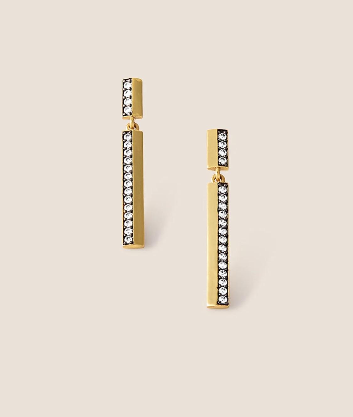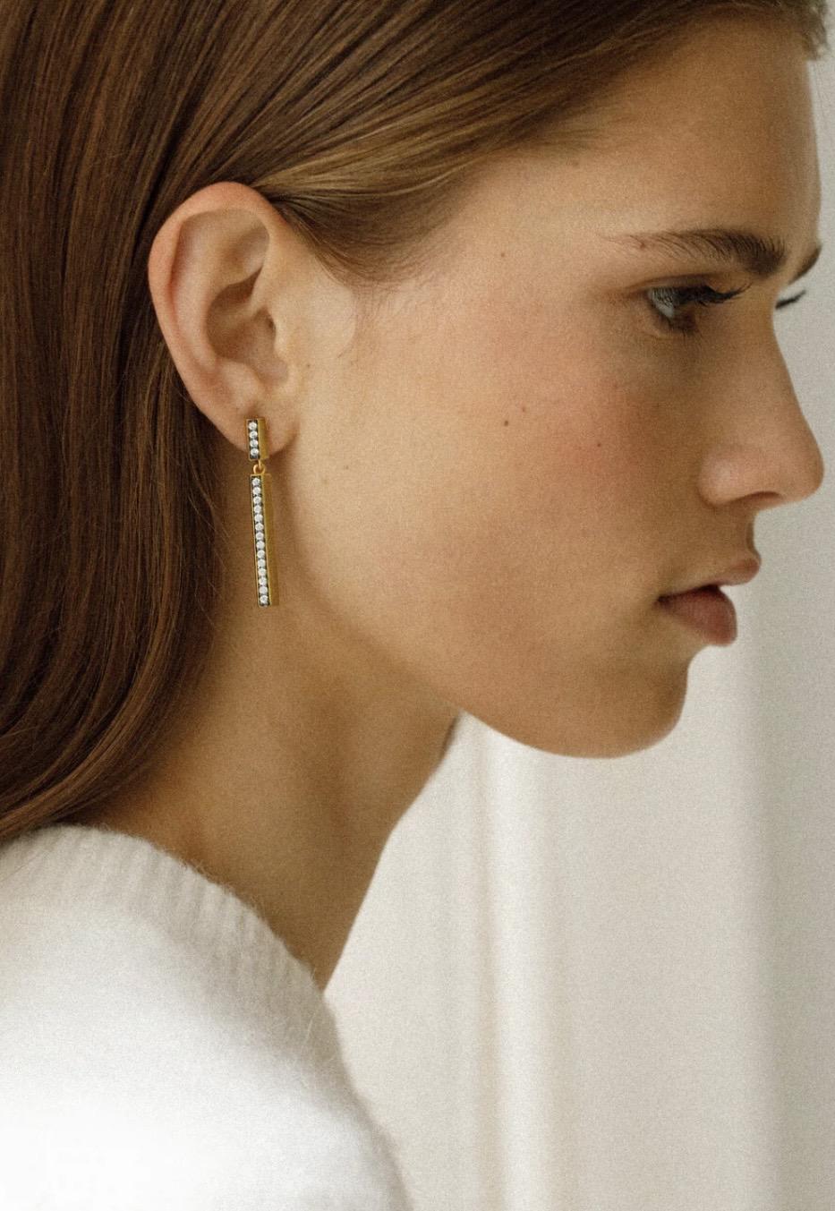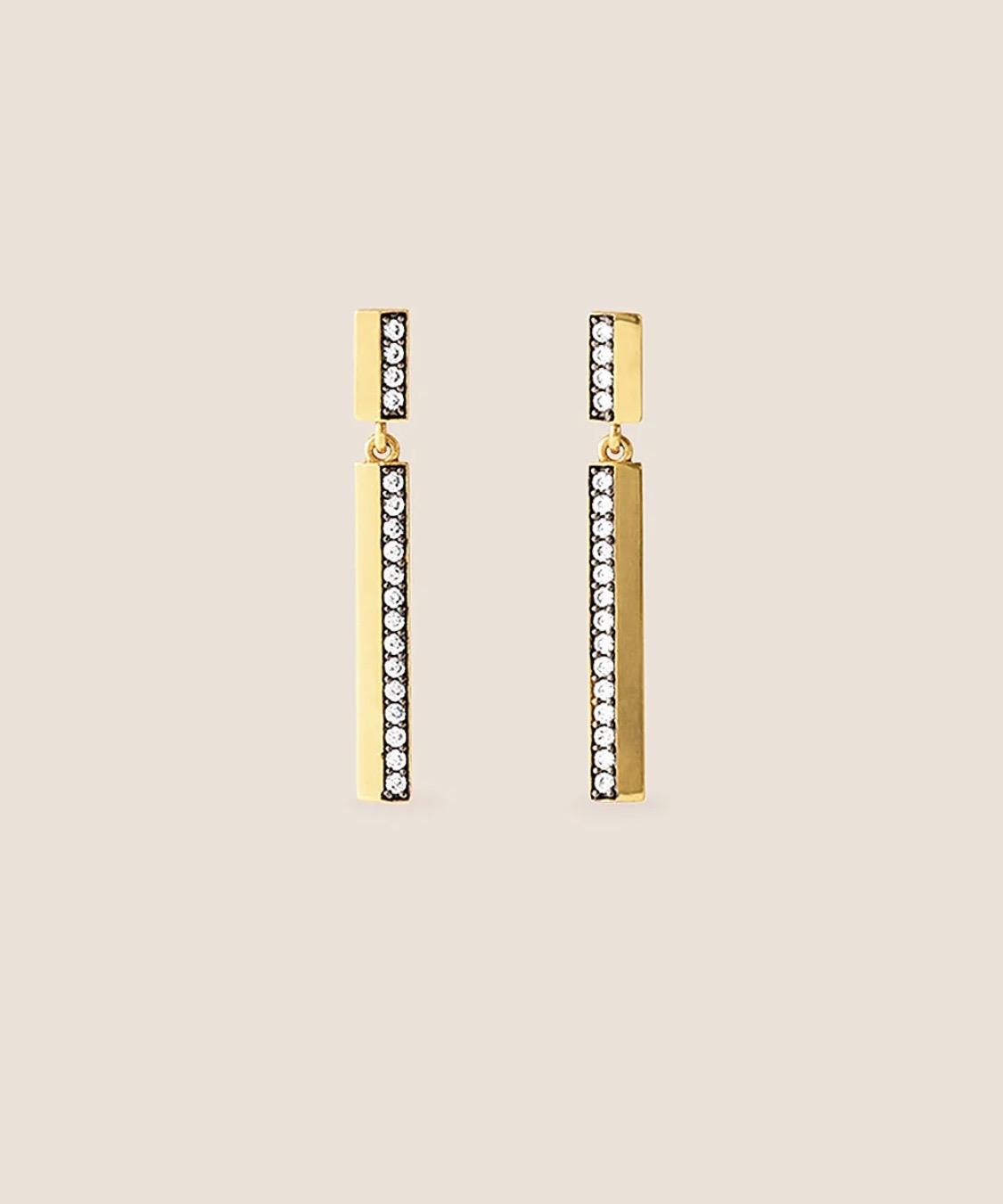 Los pendientes Cova reinterpretan la elegancia en clave contemporánea con su silueta geométrica y depurada. Elaborados en latón con baño de oro de 24 k, presentan dos piezas rectangulares enlazadas que aportan movimiento y alargan visualmente el rostro con sutileza. Cada circonita está delicadamente engastada y enmarcada por el exclusivo rodiado negro de Theodore, un acabado que potencia el brillo de las piedras y aporta un contraste sofisticado. Su diseño minimalista pero impactante los convierte en un accesorio versátil, ideal para elevar cualquier look con un toque de modernidad y distinción.