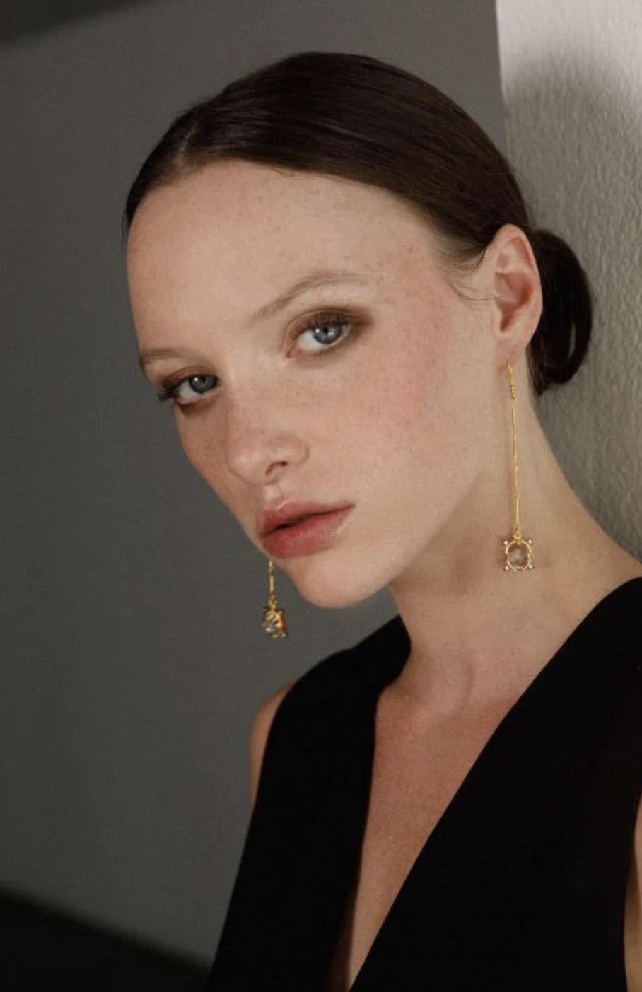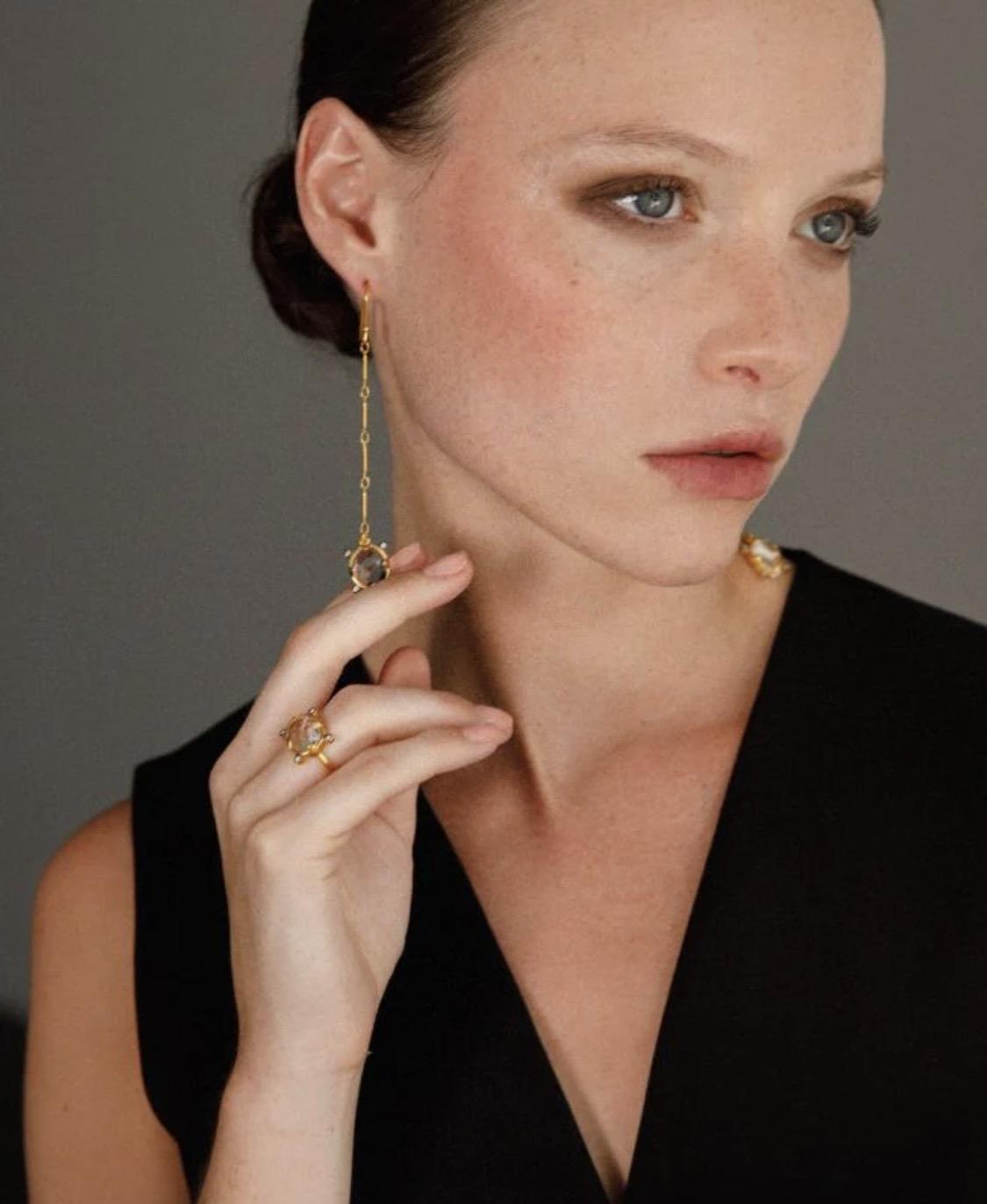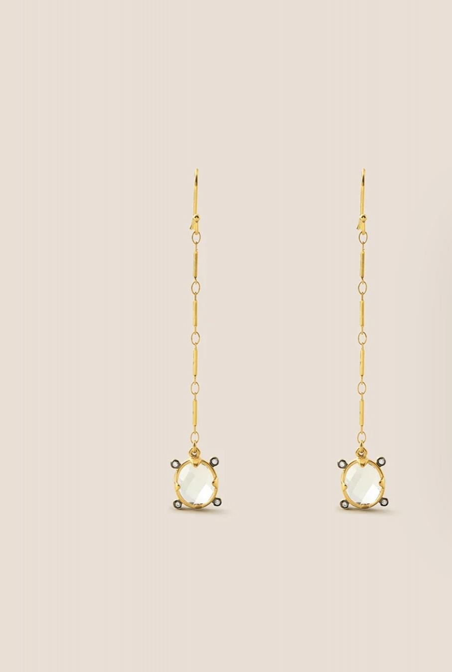 Denise es una joya que combina la atemporalidad con el desafío a lo convencional, la cadena de palitos con movimiento que acaba en un cristal tallado con circonitas hace que sea un diseño con un aire actual y moderno.