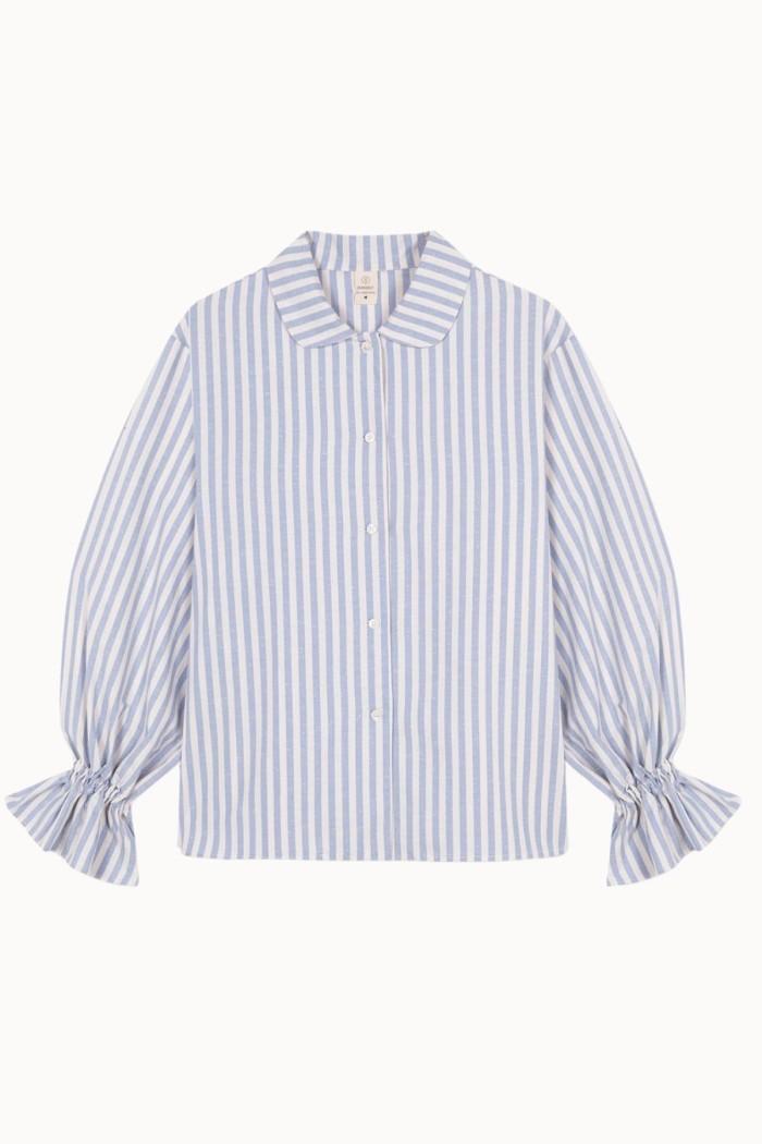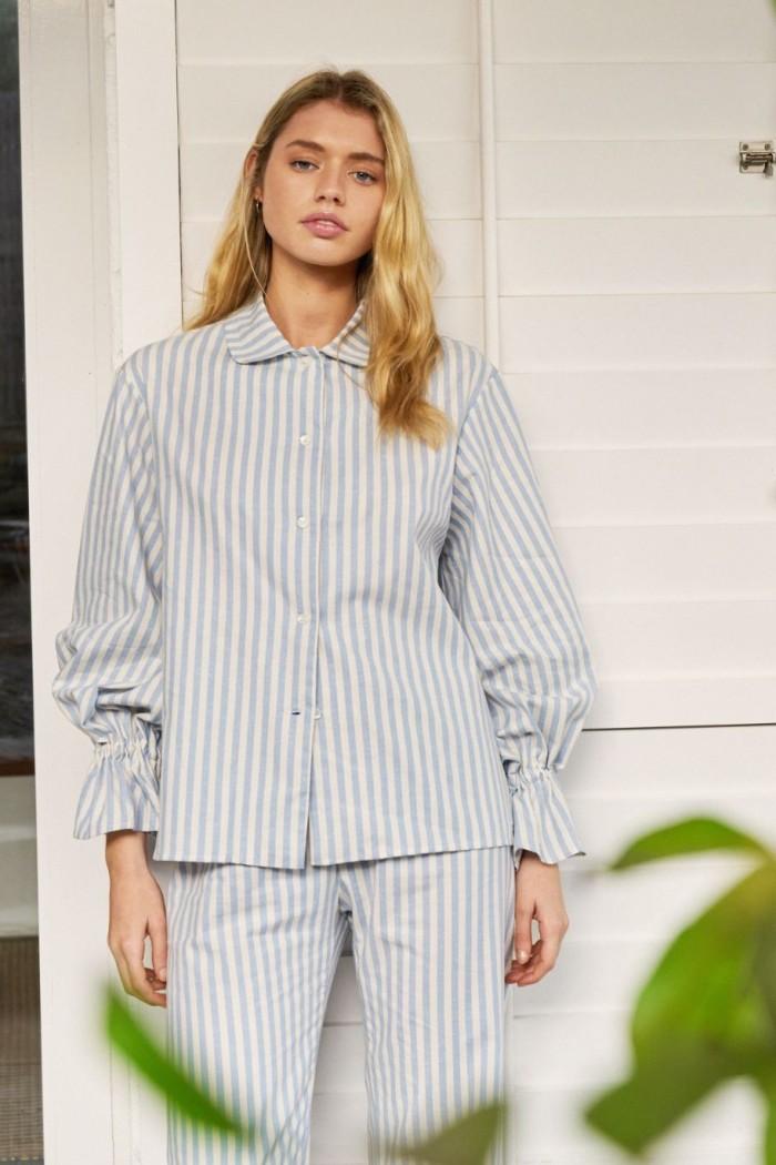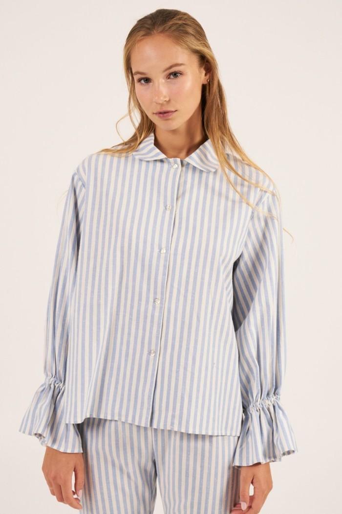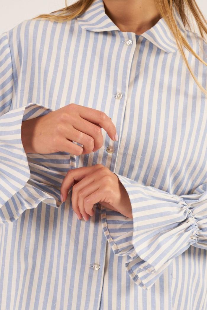 Camisa de pijama con volantes en los puños, confeccionada en tejido de rayas en tono azul y crudo. Un pijama super romántico que te acompañará en tus mejores sueños.