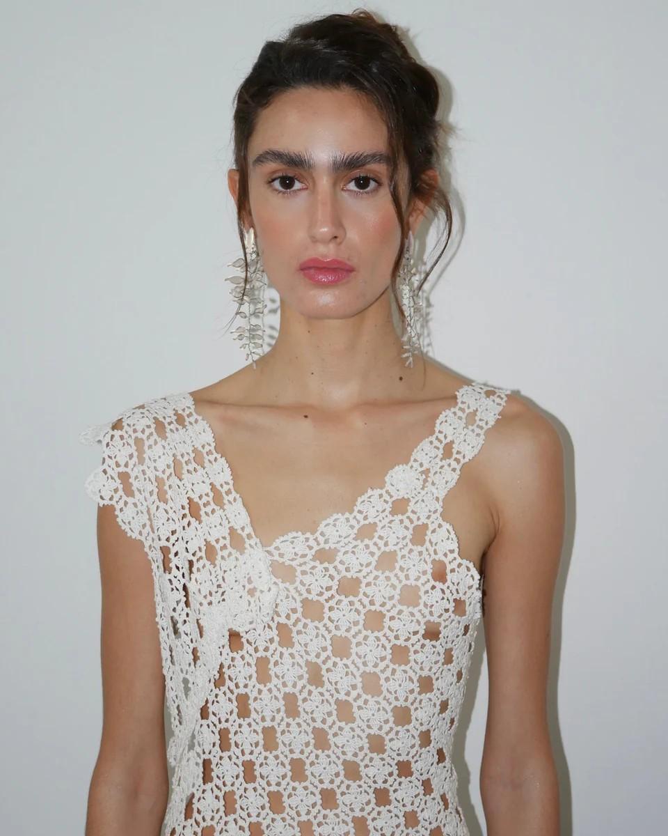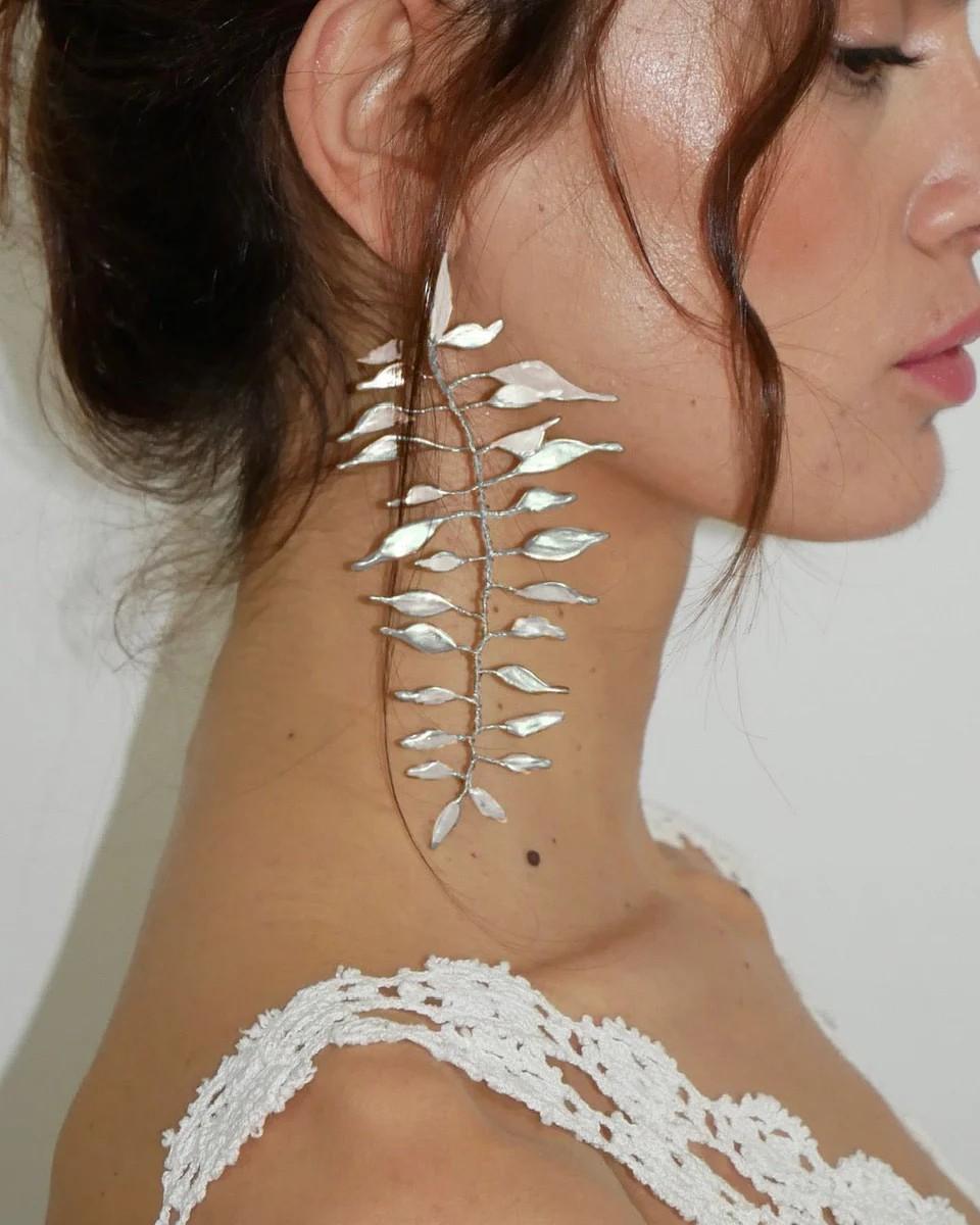 Materiales: Hilo de alpaca en latón y cobre con baño de plata. Capas infinitas creadas a través de un minucioso proceso de superposición de barnices. Cierre de hilo compuesto por un 67% de algodón y un 33% de rayón. Detalles con piezas de cristal checo, strass y abalorios cuidadosamente seleccionados.