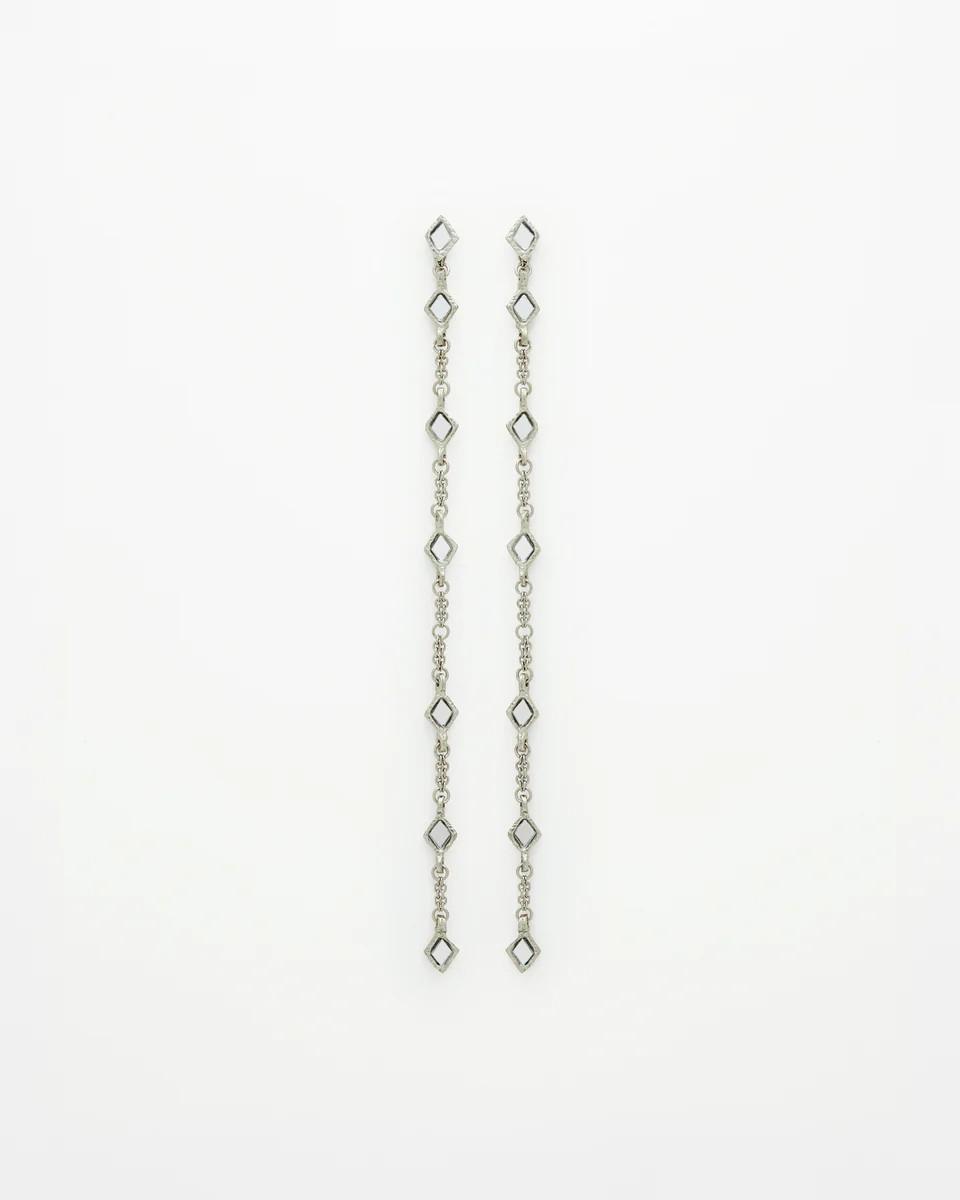 Pendientes extralargos elaborados en latón con baño de plata. Cada pieza combina una delicada cadena plateada con espejos engarzados a mano en forma de rombo. Su diseño estiliza y crea un efecto luminoso con cada movimiento. Ligeros, elegantes y muy favorecedores. Además, pueden doblarse y engancharse por la tuerca para crear una forma diferente, reinventando su silueta.