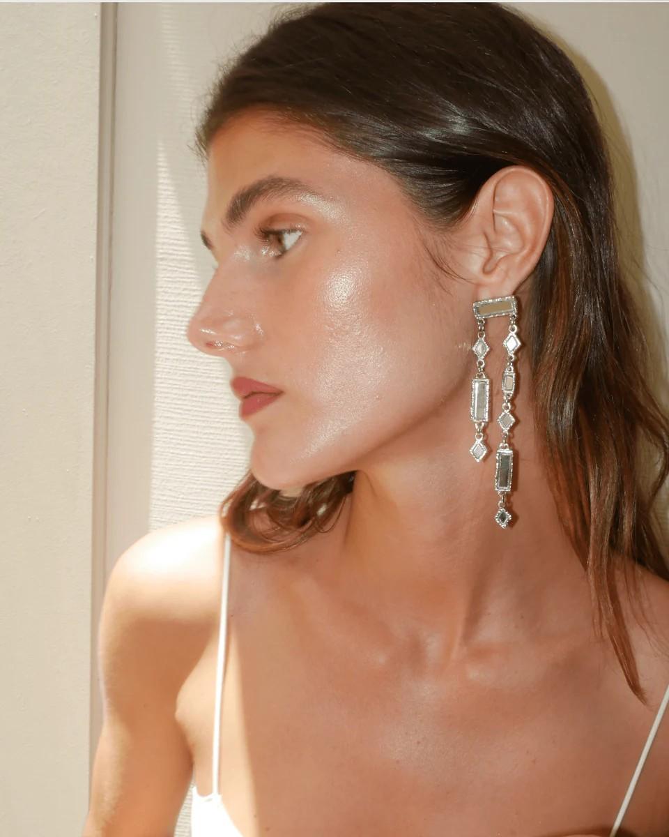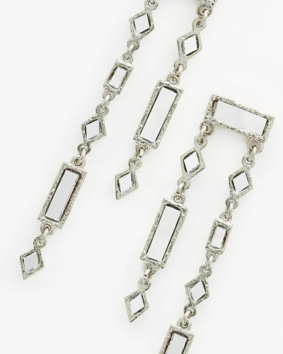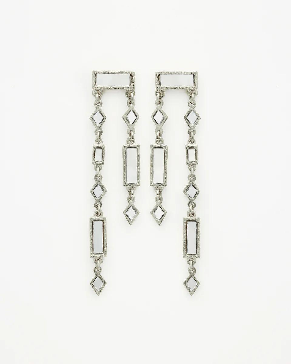 Pendientes de estructura vertical elaborados en latón con baño de plata. Presentan una combinación de piezas rectangulares y en forma de rombo con espejos engarzados a mano. Su diseño aporta luz y movimiento, creando una pieza única que eleva cualquier look con naturalidad.